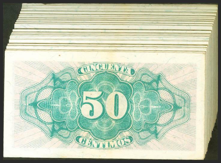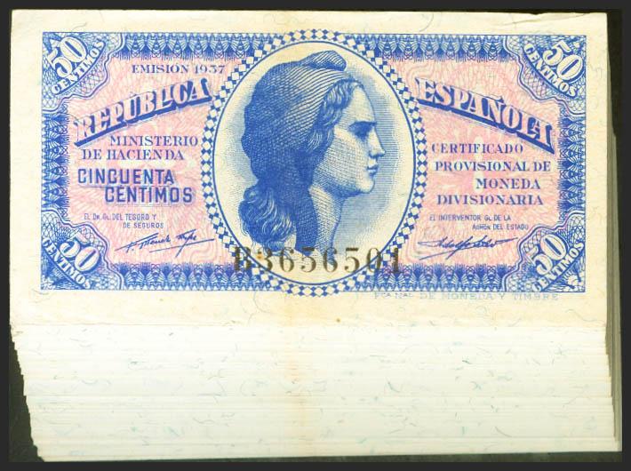 Conjunto de 100 billetes correlativos de 50 Centimos emitidos el 1937 con la serie B, (Edifil 2021: 391), conservando todo su apresto original. SC/SC-.