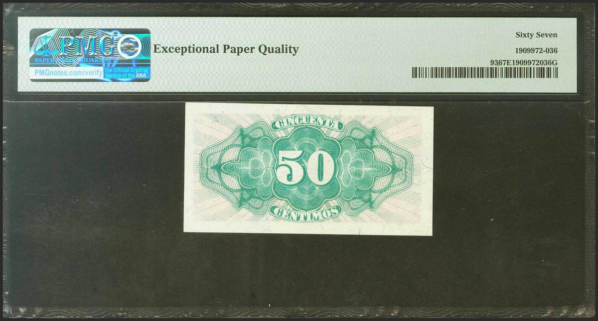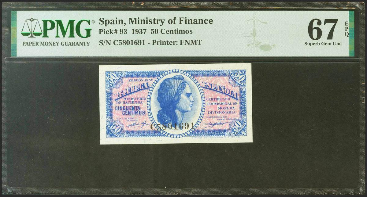50 Céntimos. 1937. Ministerio de Hacienda. Serie C, última serie emitida. (Edifil 2021: 391a, Pick: 93). Raro en esta excepcional conservación, apresto original. SC. Encapsulado PMG67EPQ.
