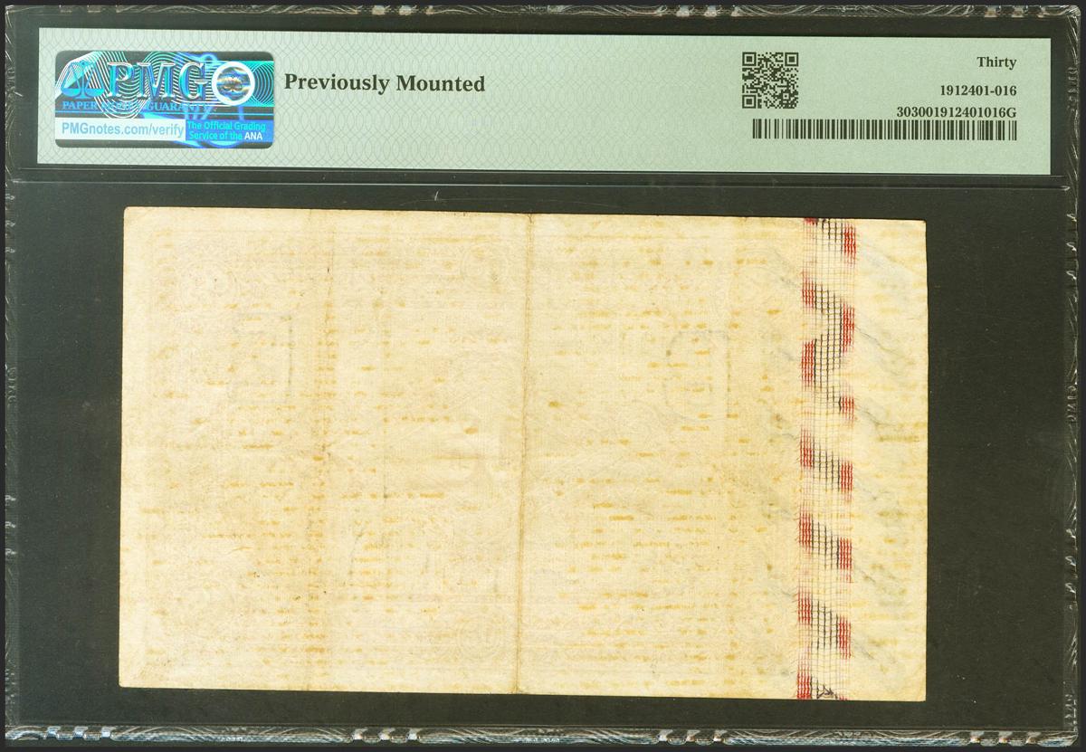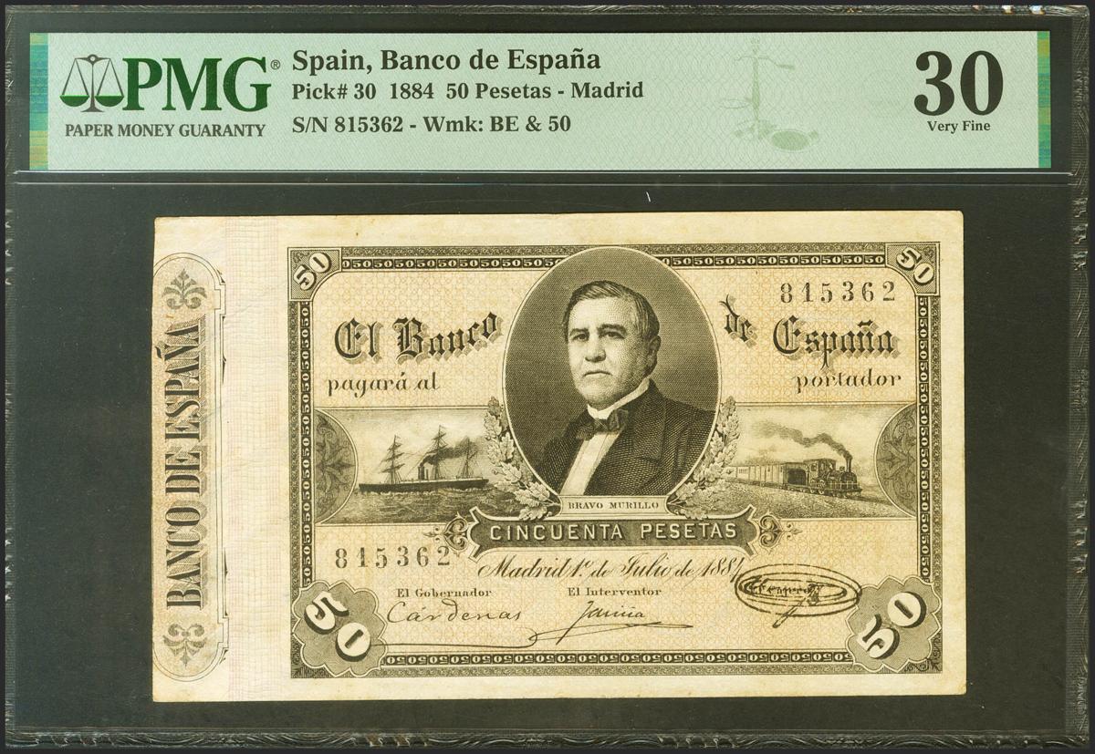 50 Pesetas. 1 de Julio de 1884. Sin serie. (Edifil 2021: 288, Pick: 30). Muy raro, especialmente sin reparaciones. MBC+. Encapsulado PMG30 (previously mounted).