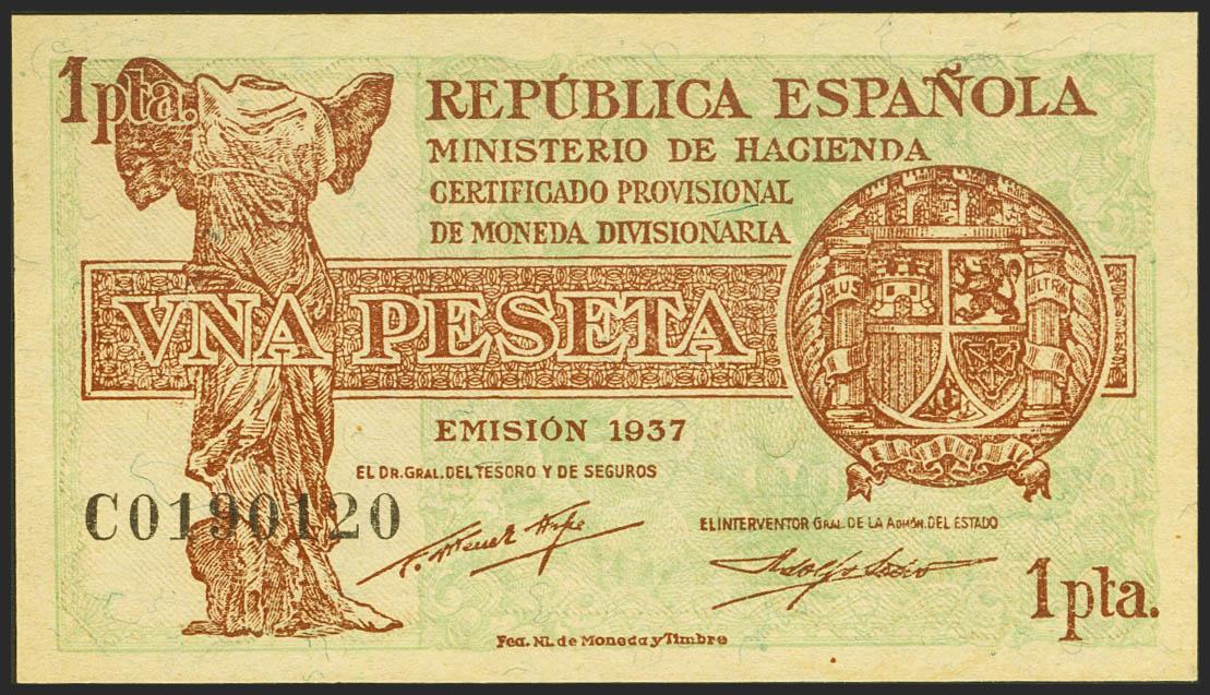 1 Peseta. 1937. Ministerio de Hacienda. Serie C, última serie emitida. (Edifil 2021: 392a). Inusual serie sin circular, papel de tonalidad grisácea tal y como fue emitido, apresto original. SC.