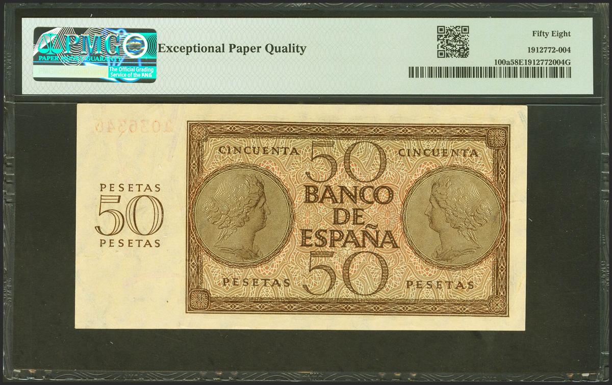 50 Pesetas. 21 de Noviembre de 1936. Serie Q. (Edifil 2021: 420a, Pick: 100a). Apresto original. EBC+++. Encapsulado PMG58EPQ.