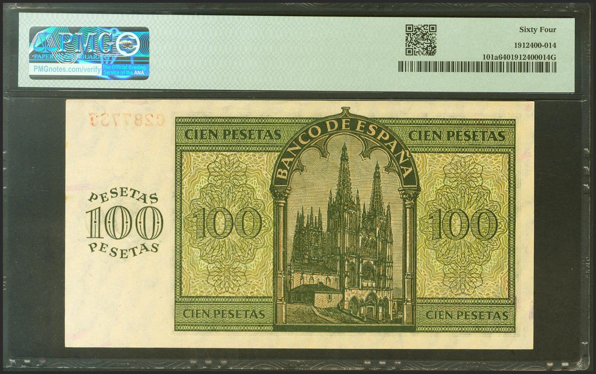 100 Pesetas. 21 de Noviembre de 1936. Serie C. (Edifil 2021: 421a, Pick: 101a). Inusual en esta calidad. SC. Encapsulado PMG64.