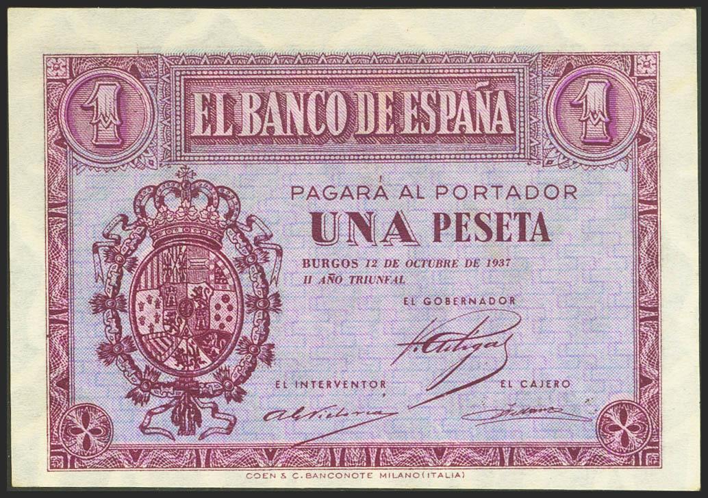 1 Peseta. 12 de Octubre de 1937. Serie D. (Edifil 2021: 425a). Conserva parte de su apresto original. EBC++.