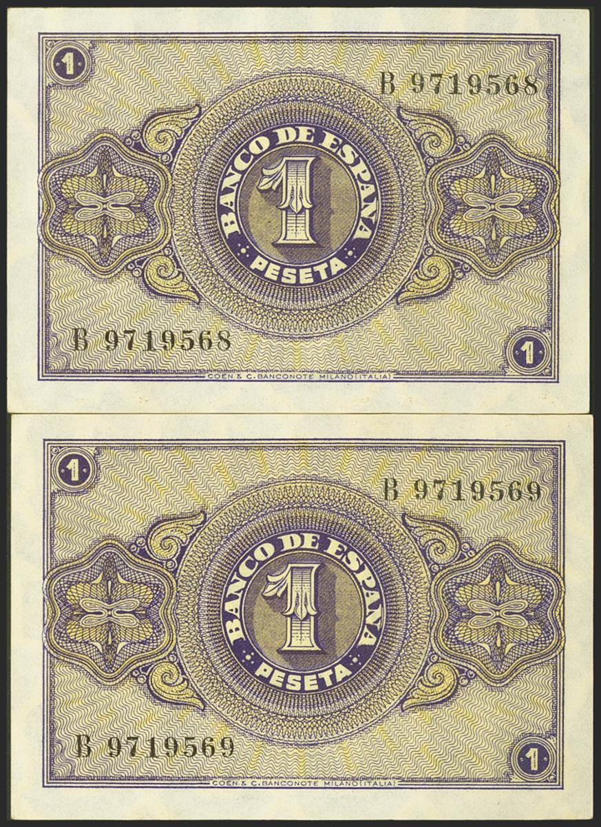 1 Peseta. 28 de Febrero de 1938. Pareja correlativa. Serie B. (Edifil 2021: 427a). Apresto original. SC-.