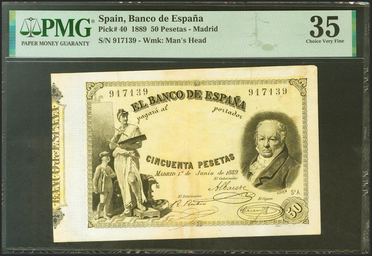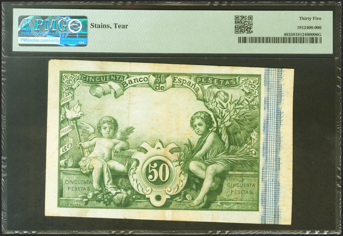 50 Pesetas. 1 de Junio de 1889. Serie A. (Edifil 2021: 298, Pick: 40). Muy raro especialmente sin reparaciones y en esta calidad, roturita en el margen inferior en la parte de la doblez central. MBC+. Encapsulado PMG35 (stains, tear).