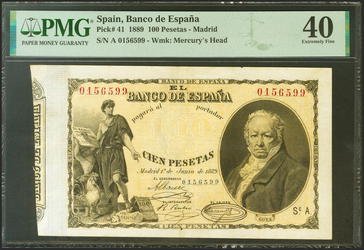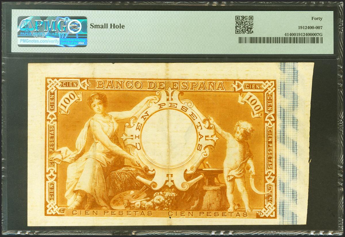 100 Pesetas. 1 de Junio de 1889. Serie A. (Edifil 2021: 299, Pick: 41). Muy raro especialmente sin reparaciones y en esta calidad, agujerito en la doblez central. EBC-. Encapsulado PMG40 (small holes).