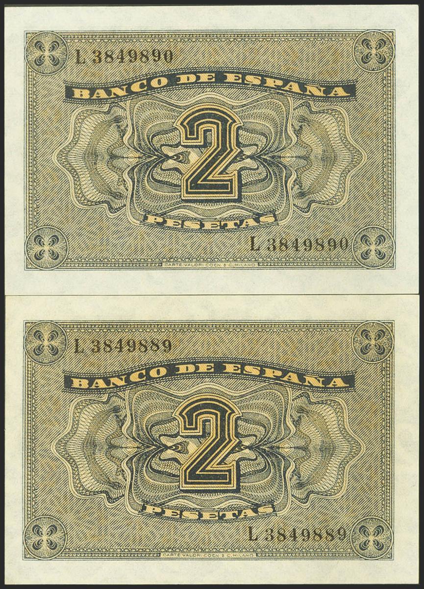 2 Pesetas. 30 de Abril de 1938. Pareja correlativa. Serie L. (Edifil 2021: 429a). Conserva todo su apresto original. SC.