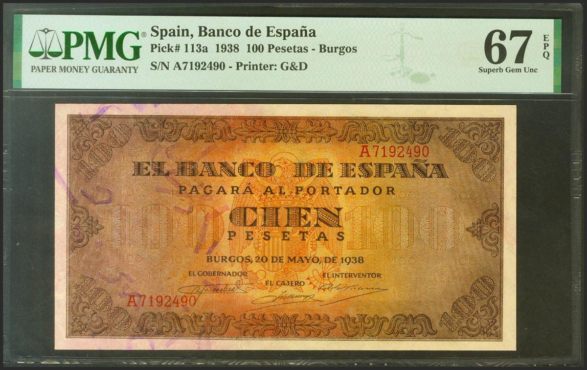 100 Pesetas. 20 de Mayo de 1938. Serie A. (Edifil 2021: 432, Pick: 113a). Extraordinariamente raro en esta excepcional calidad, apresto original. SC. Encapsulado PMG67EPQ. (para hacernos idea de la rareza, a fecha 1/12/2022, el billete se trata del mejor calificado en PMG junto a otros 11 billetes)