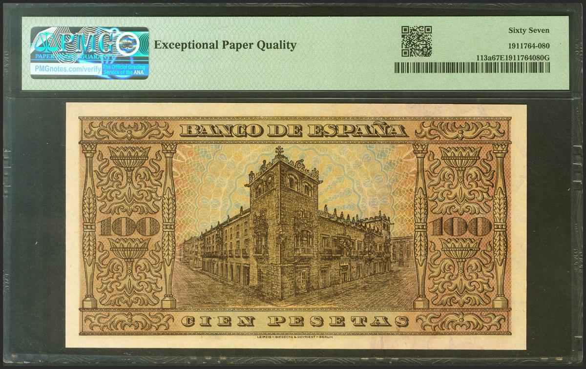100 Pesetas. 20 de Mayo de 1938. Serie A. (Edifil 2021: 432, Pick: 113a). Extraordinariamente raro en esta excepcional calidad, apresto original. SC. Encapsulado PMG67EPQ. (para hacernos idea de la rareza, a fecha 1/12/2022, el billete se trata del mejor calificado en PMG junto a otros 11 billetes)