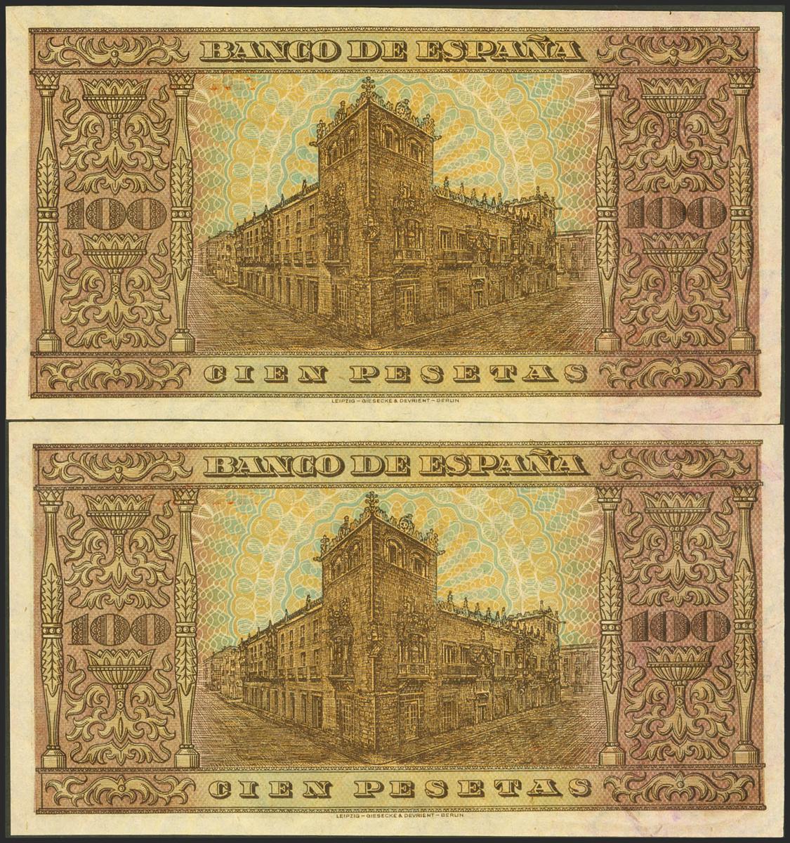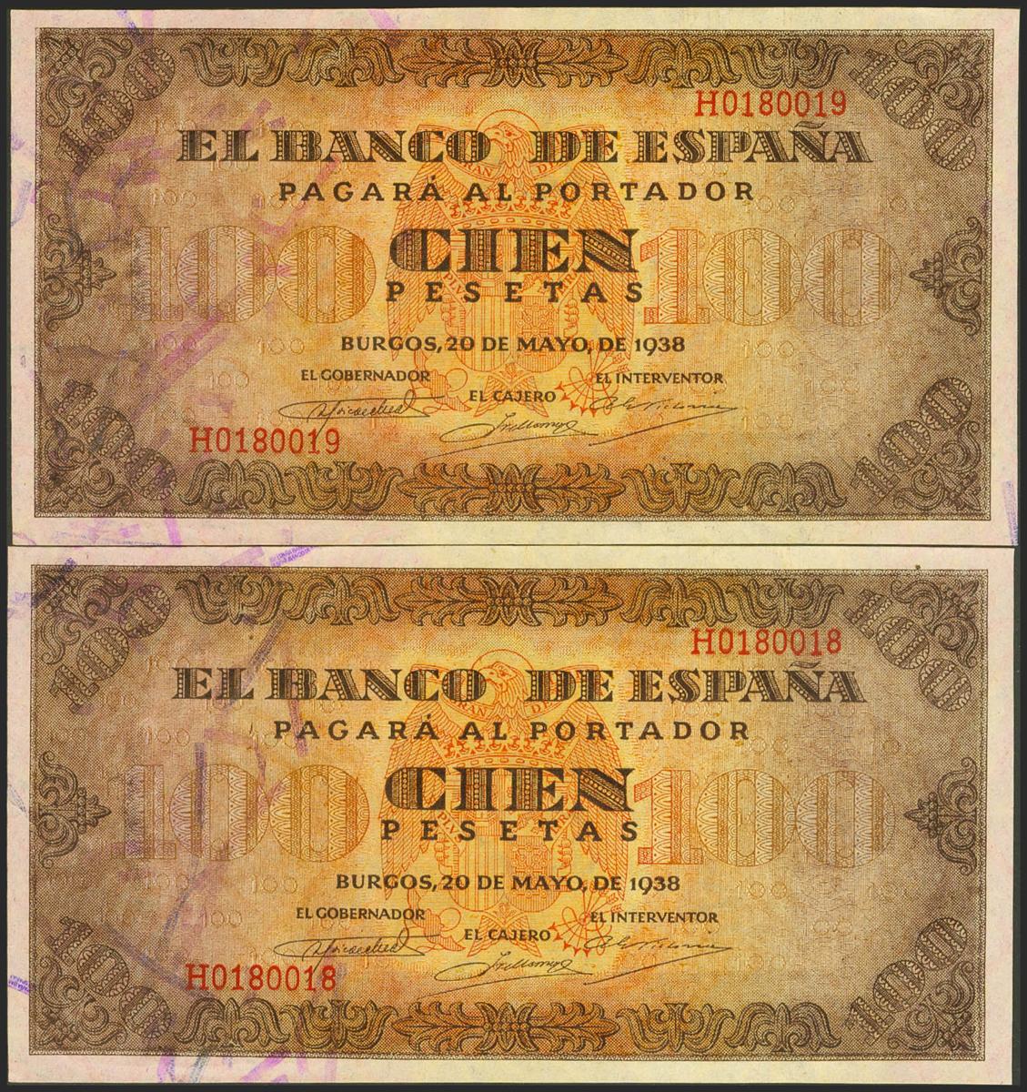 100 Pesetas. 20 de Mayo de 1938. Pareja correlativa. Serie H, última serie emitida. (Edifil 2021: 432a). Conserva todo su apresto original, ondulación central que no rompe fibra. EBC+++.