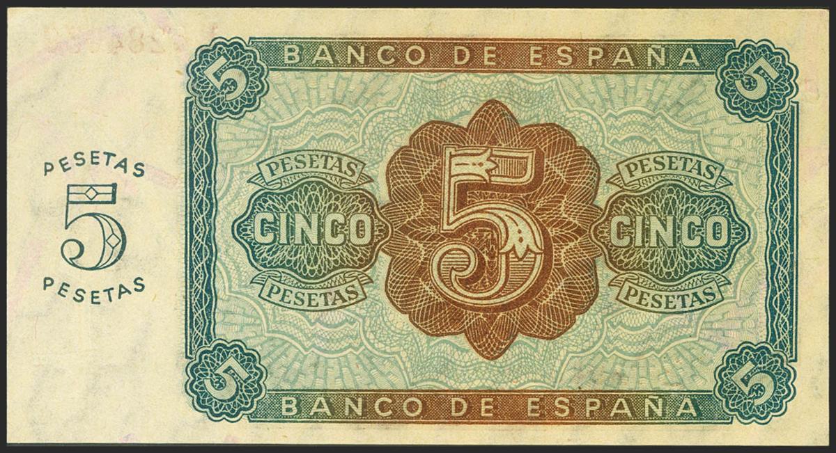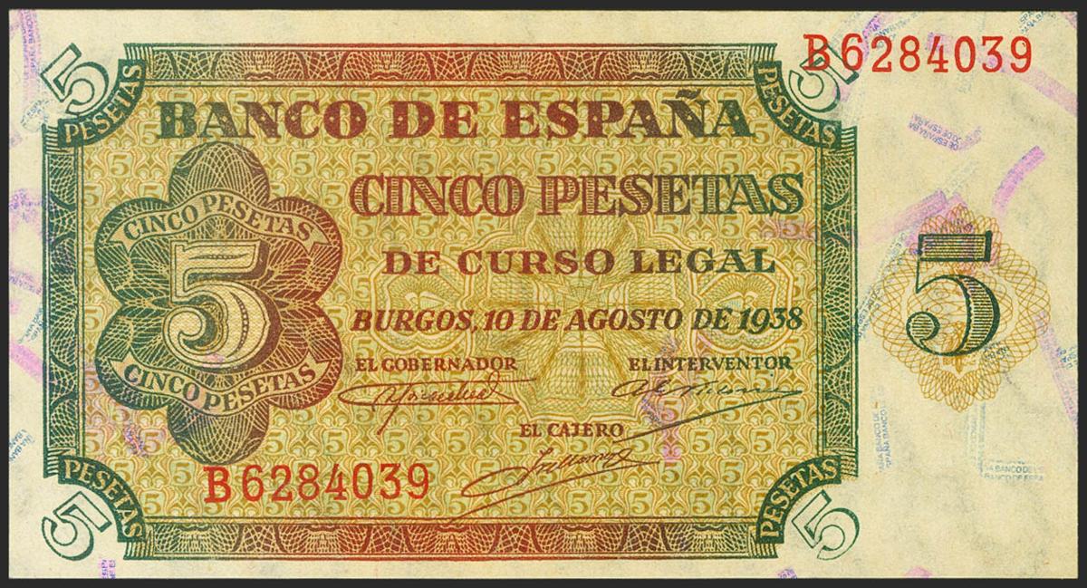 5 Pesetas. 10 de Agosto de 1938. Serie B. (Edifil 2021: 435a). Apresto original. SC.