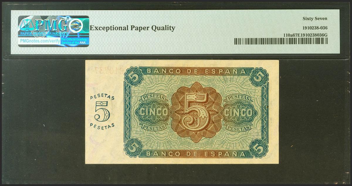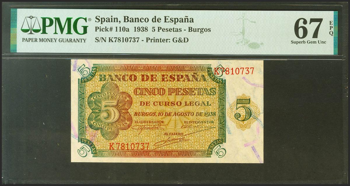 5 Pesetas. 10 de Agosto de 1938. Serie K. (Edifil 2021: 435a, Pick: 110a). Raro en esta conservación, apresto original. SC. Encapsulado PMG67EPQ.
