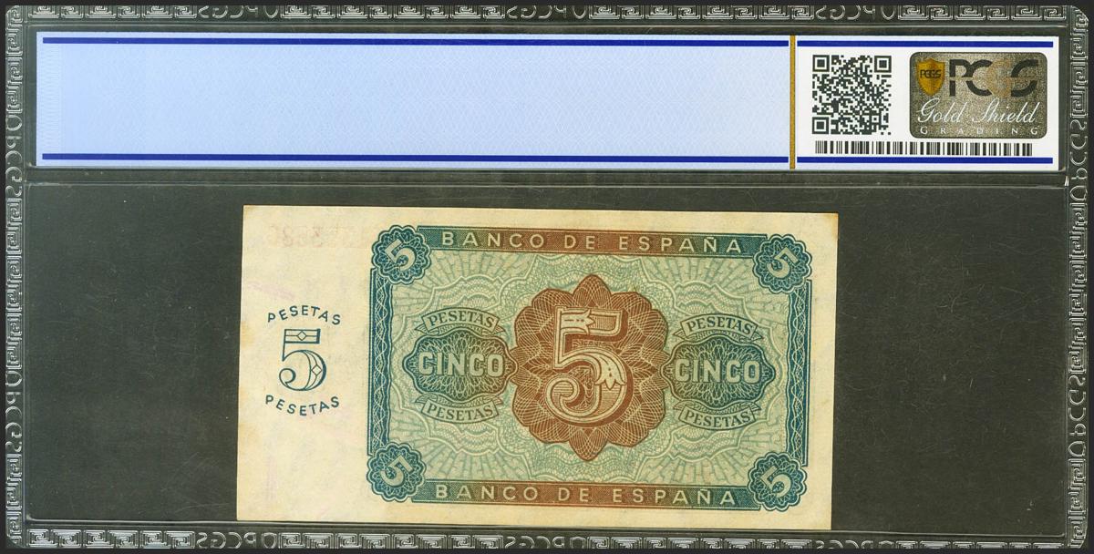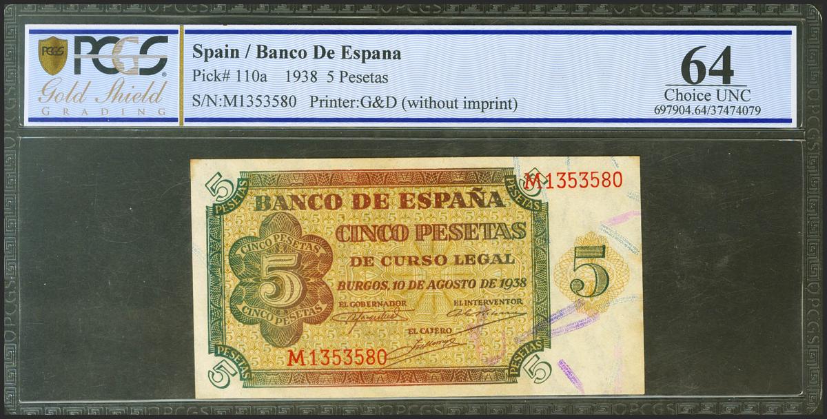 5 Pesetas. 10 de Agosto de 1938. Serie M, última serie emitida. (Edifil 2021: 435b, Pick: 110a). Rarísima serie, especialmente en esta calidad. SC. Encapsulado PCGS64.