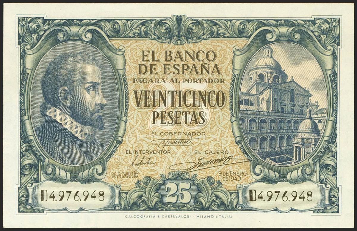 25 Pesetas. 9 de Enero de 1940. Serie D. (Edifil 2021: 436a). Conserva gran parte de su apresto original. EBC+.