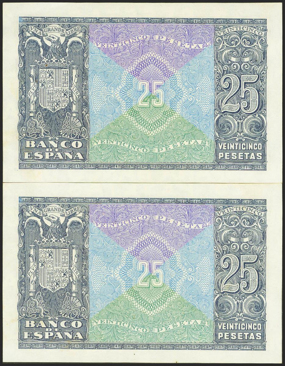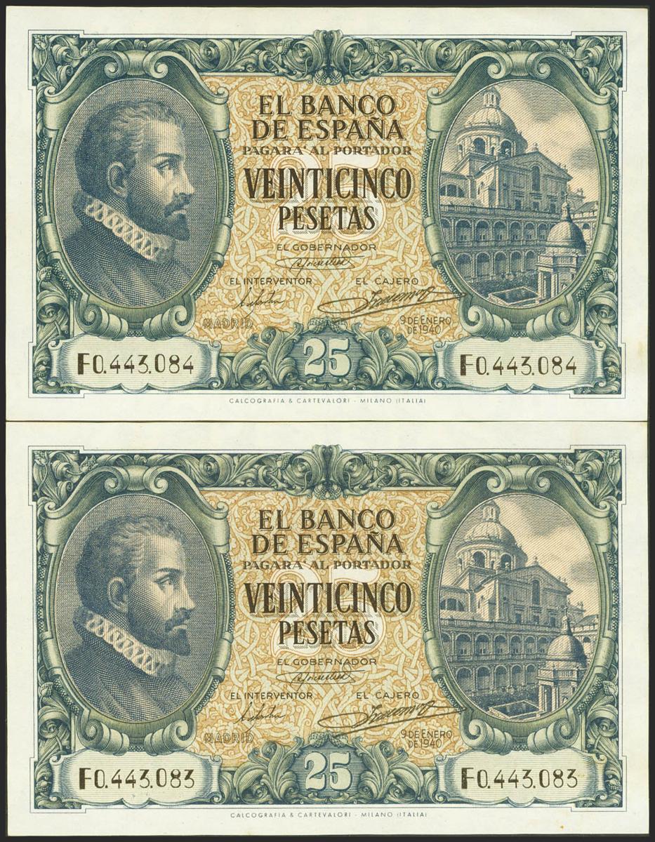 25 Pesetas. 9 de Enero de 1940. Pareja correlativa. Serie F, última serie emitida. (Edifil 2021: 436a). Apresto original. SC-.