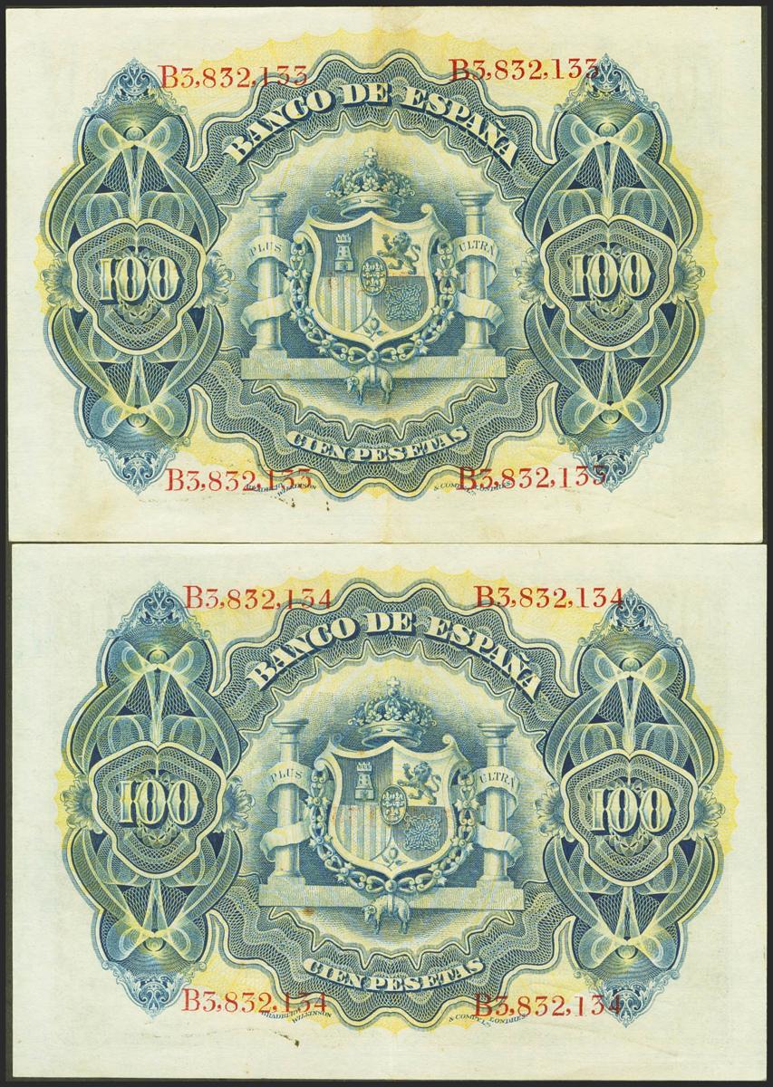 100 Pesetas. 30 de Junio de 1906. Pareja correlativa. Serie B. (Edifil 2021: 313a). Rarísima pareja, especialmente en esta conservación, apresto original. EBC.