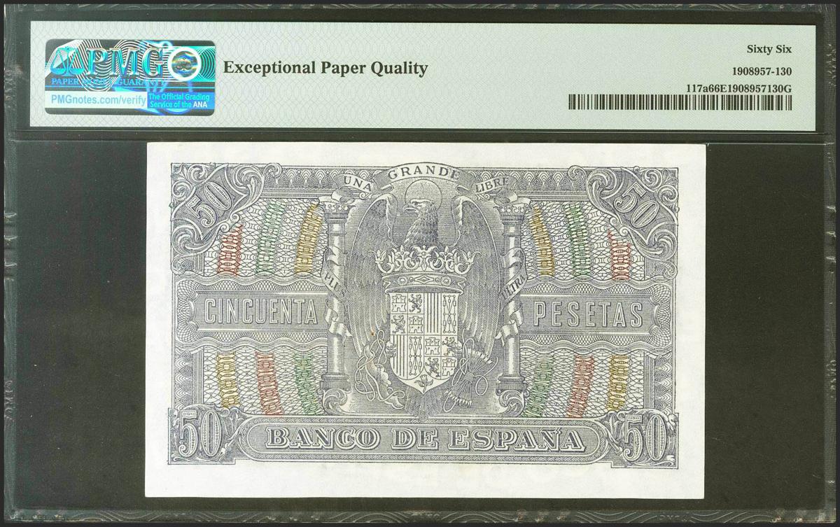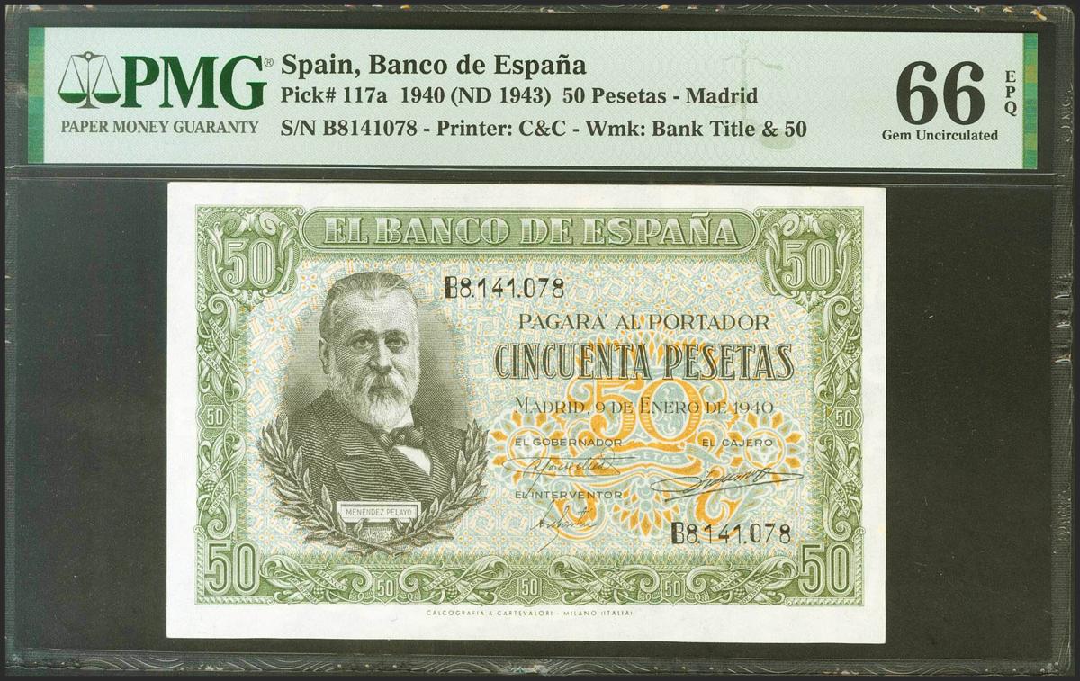 50 Pesetas. 9 de Enero de 1940. Serie B. (Edifil 2021: 437a, Pick: 117a). Inusual en esta excepcional calidad, apresto original. SC. Encapsulado PMG66EPQ
