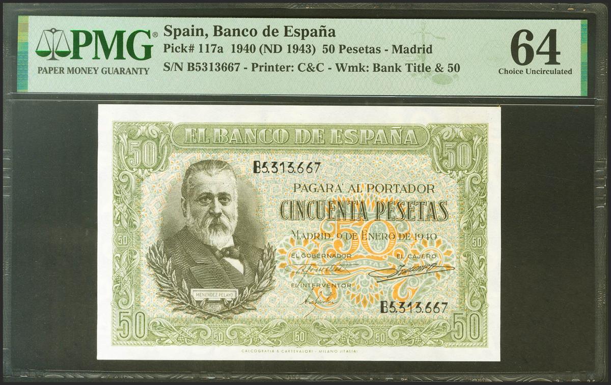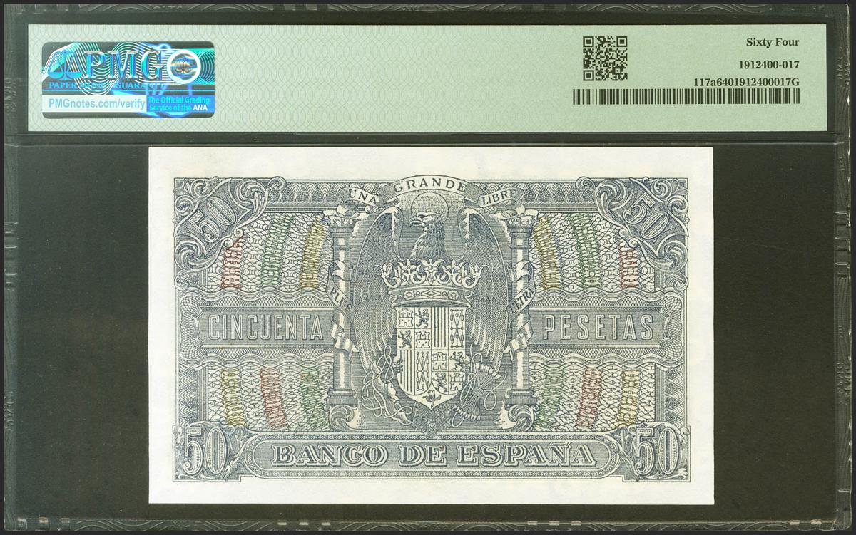 50 Pesetas. 9 de Enero de 1940. Serie B. (Edifil 2021: 437a, Pick: 117a). Inusual en esta calidad. SC. Encapsulado PMG64.