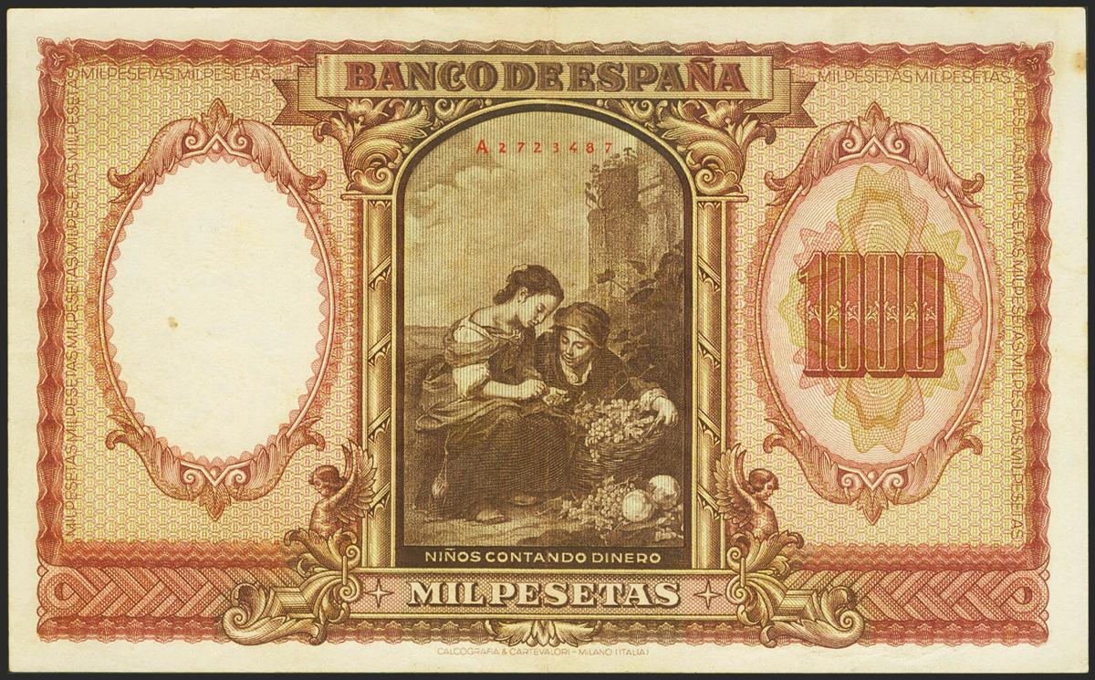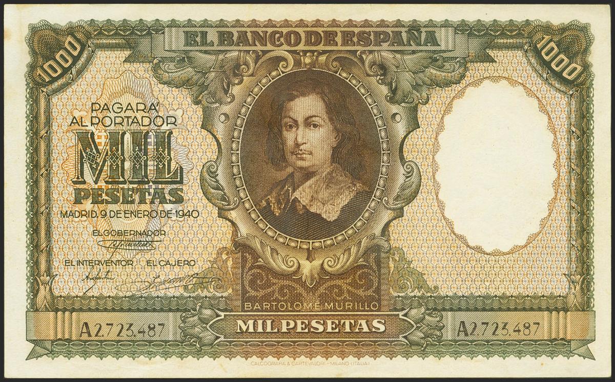 1000 Pesetas. 9 de Enero de 1940. Serie A. (Edifil 2021: 440). Conserva parte de su apresto original, billete de gran espectacularidad. MBC+.