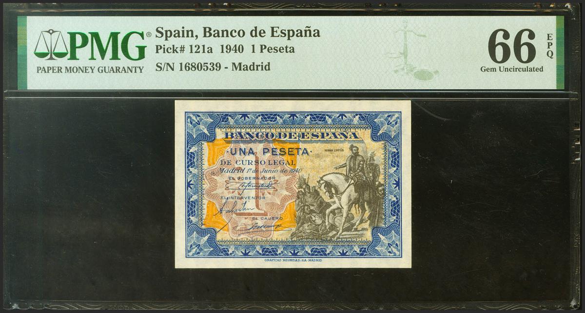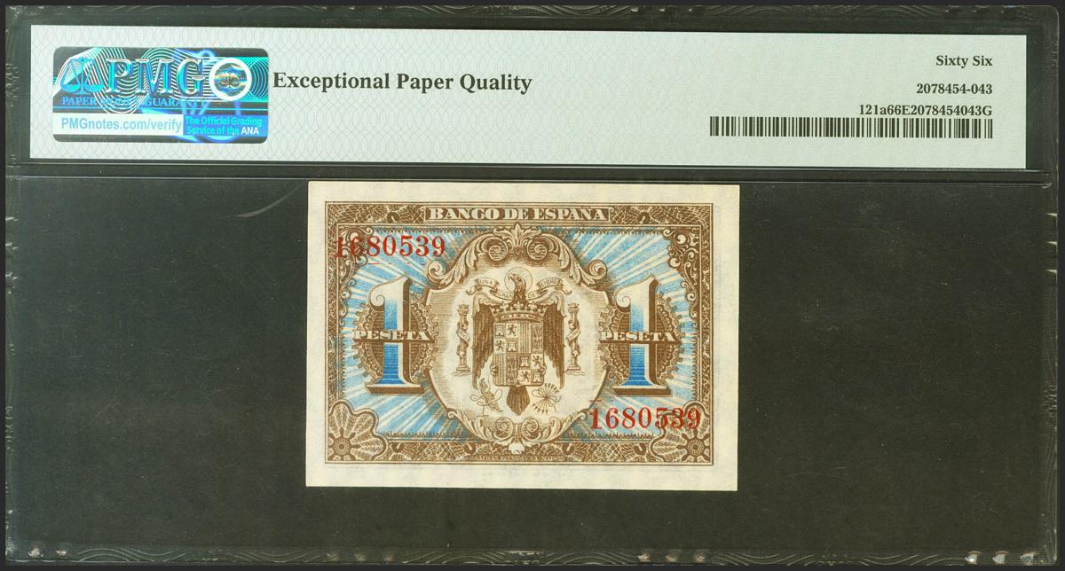 1 Pesetas. 1 de Junio de 1940. Sin serie. (Edifil 2021: 441, Pick: 121a). Raro en esta calidad, apresto original. SC. Encapsulado PMG66EPQ.
