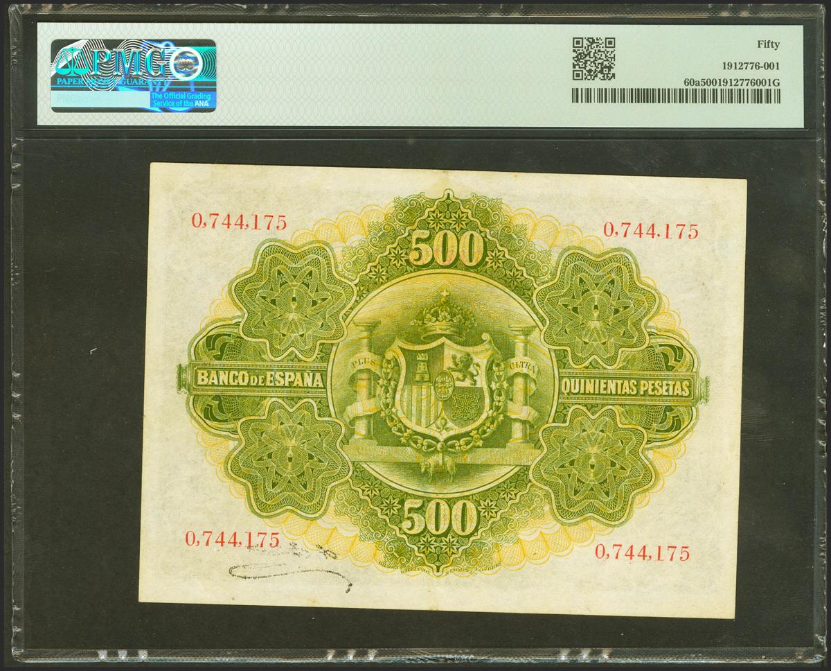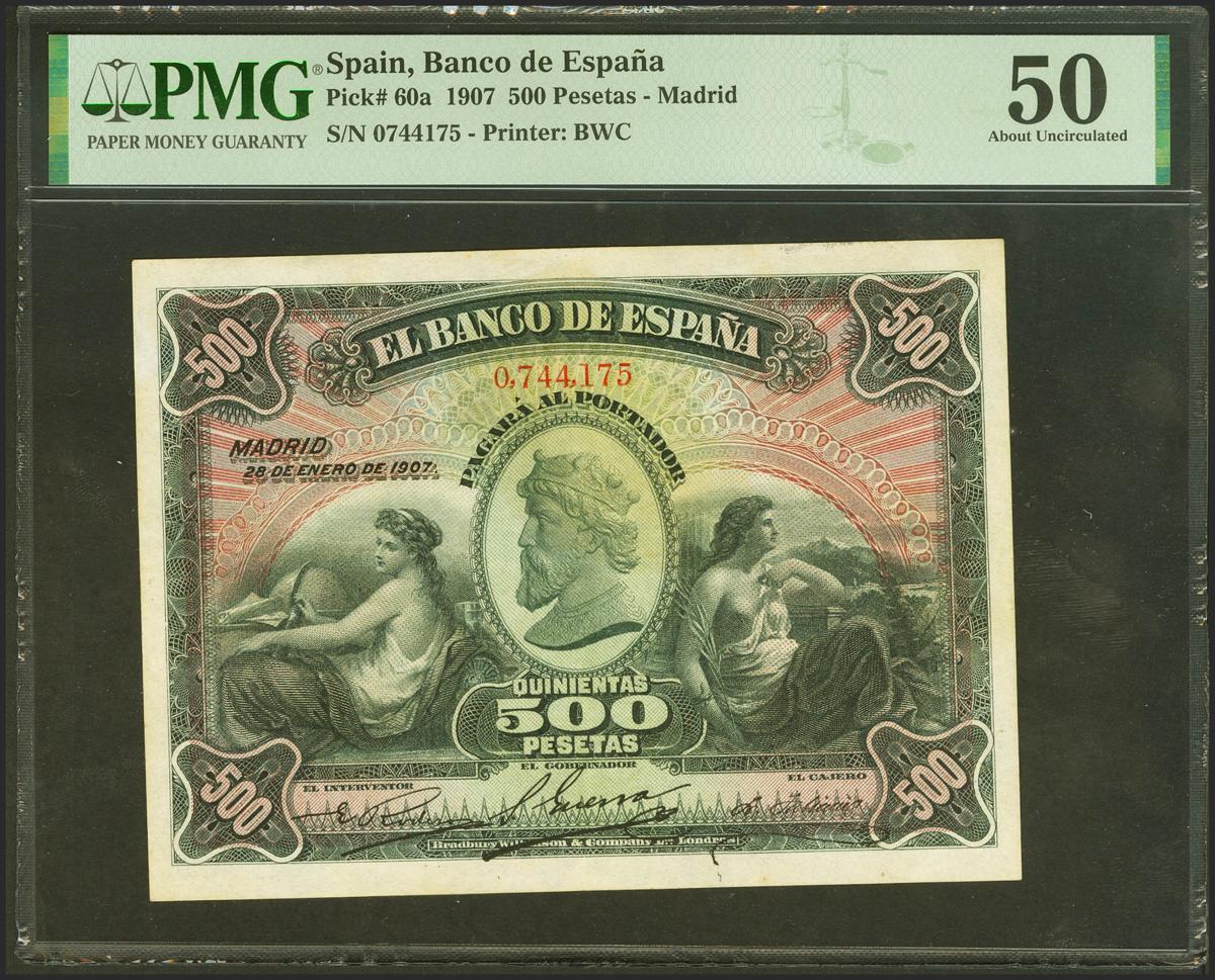 500 Pesetas. 28 de Enero de 1907. Sin serie. (Edifil 2021: 316, Pick: 60a). Rarísimo, especialmente en esta calidad y sin ninguna reparación, espectacular presencia. EBC. Encapsulado PMG50. (para hacernos idea de la rareza, a fecha 1 de Abril de 2023, este billete es el quinto mejor calificado junto a otros 4 billetes en PMG)