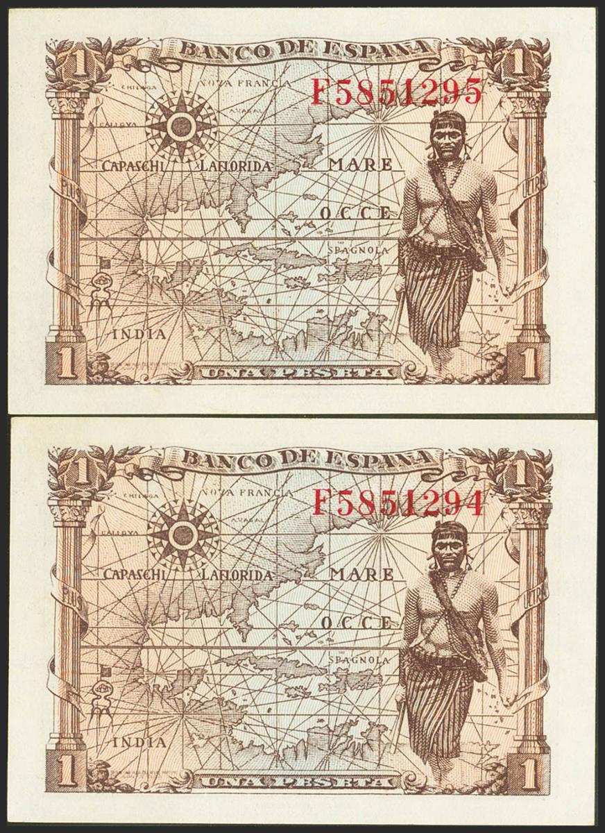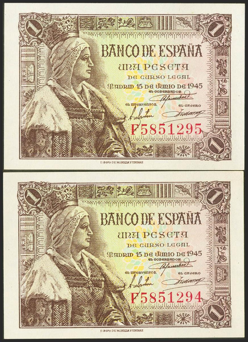 1 Peseta. 15 de Junio de 1945. Pareja correlativa. Serie F. (Edifil 2021: 448a). Apresto original. SC.