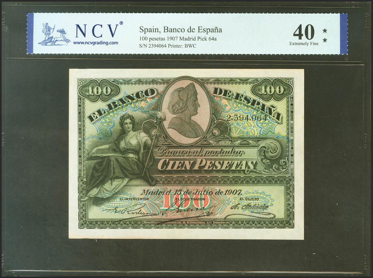100 Pesetas. 15 de Julio de 1907. (Edifil 2021: 320, Pick: 64a). Mínimamente reparado. EBC-. Encapsulado NCV40.