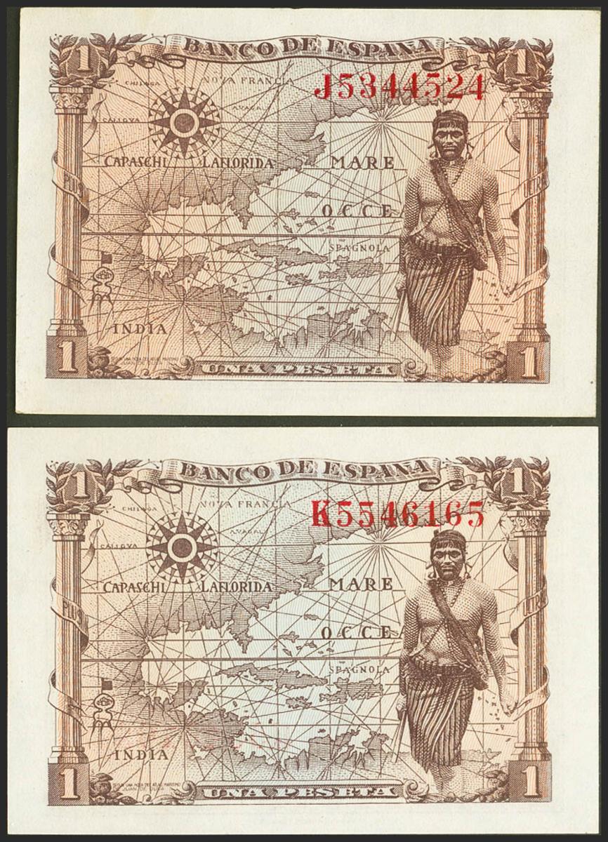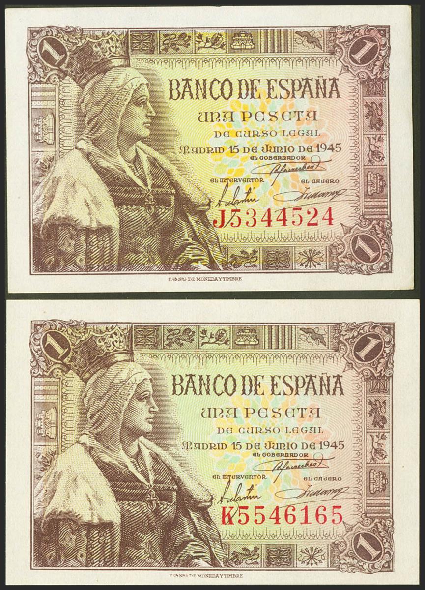 Conjunto de 2 billetes emitidos el 15 de Junio de 1945, con las series J y K, respectivamente (Edifil 2021: 448a), apresto original. SC/SC-.