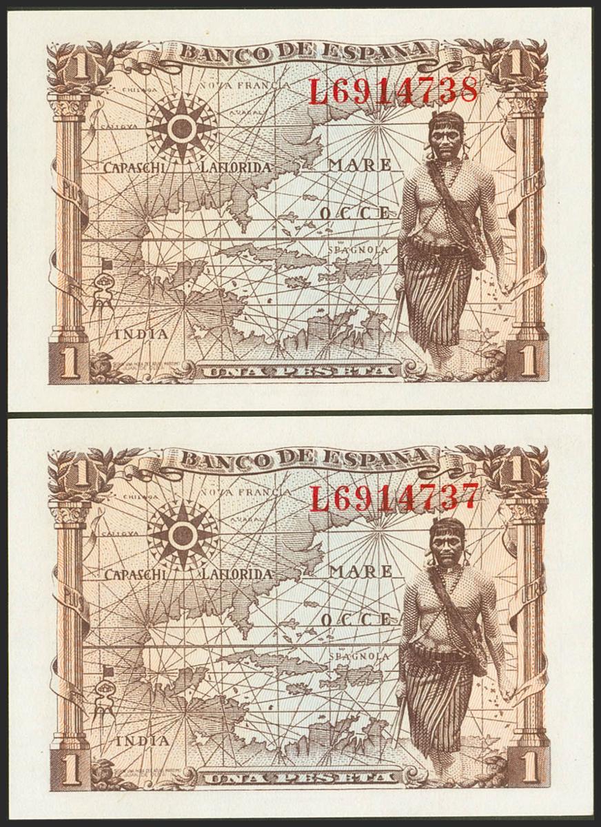 1 Peseta. 15 de Junio de 1945. Pareja correlativa. Serie L. (Edifil 2021: 448a). Apresto original. SC-.