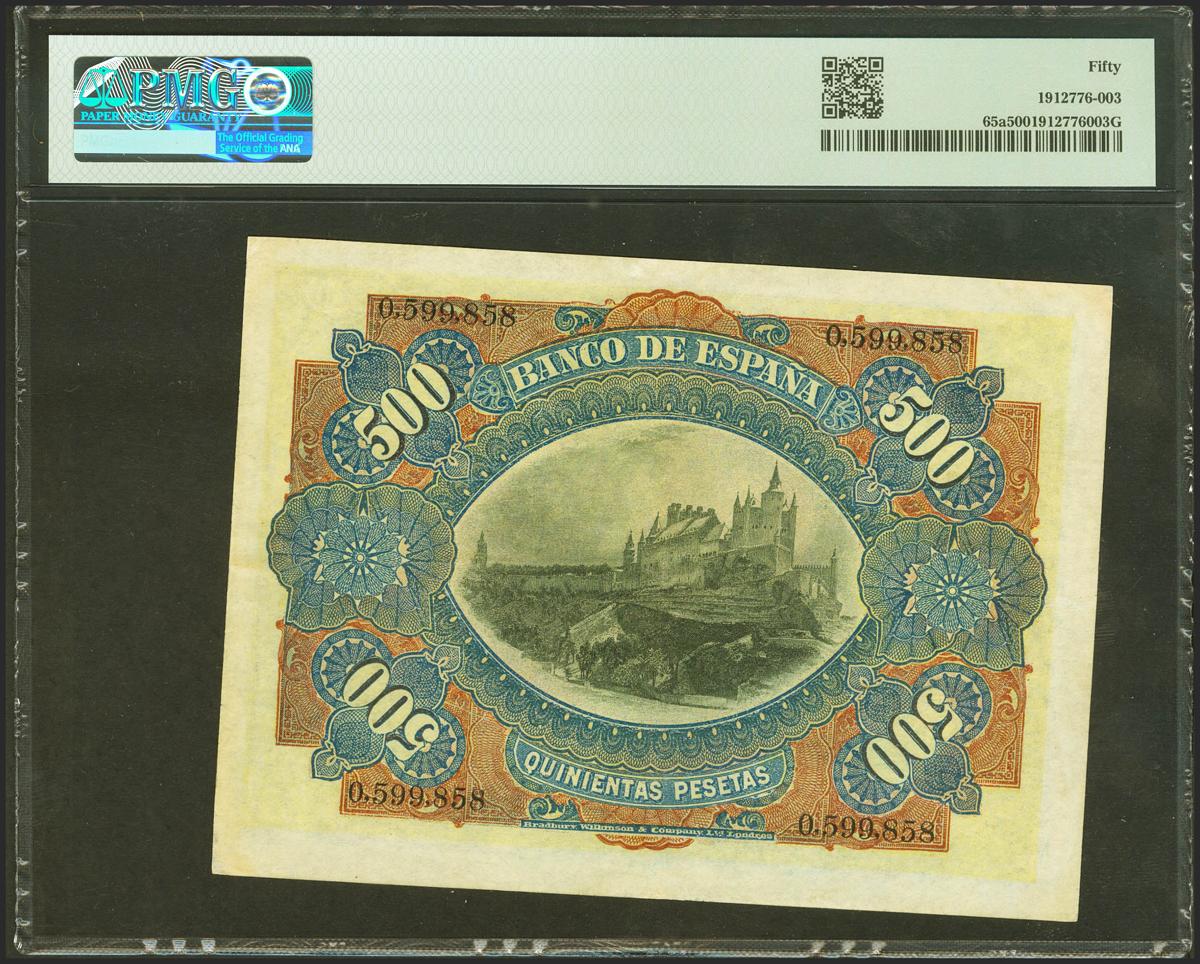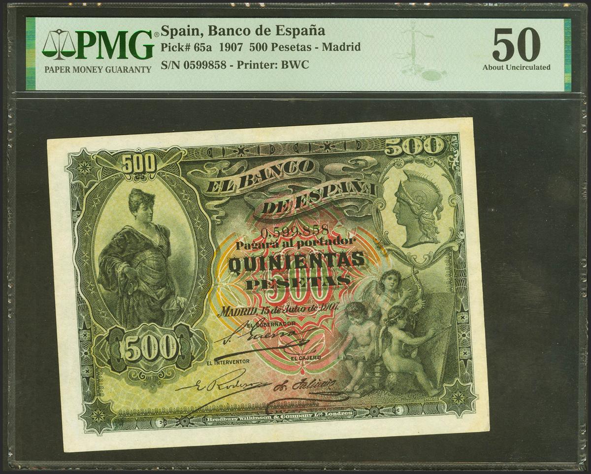 500 Pesetas. 15 de Julio de 1907. Sin serie. (Edifil 2021: 321, Pick: 65a). Rarísimo, especialmente en esta calidad y sin ninguna reparación, espectacular presencia. EBC. Encapsulado PMG50.