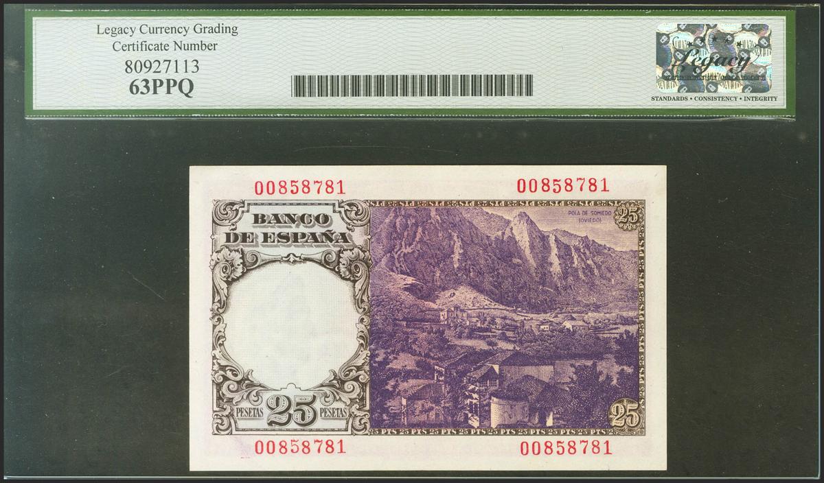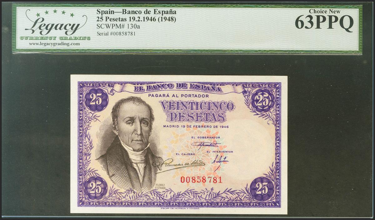 25 Pesetas. 19 de Febrero de 1946. Sin serie. (Edifil 2021: 450, Pick: 130a). Inusual en esta calidad, apresto original. SC. Encapsulado LEGACY63PPQ.