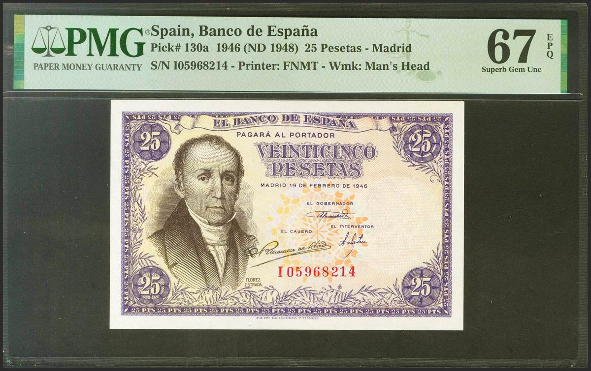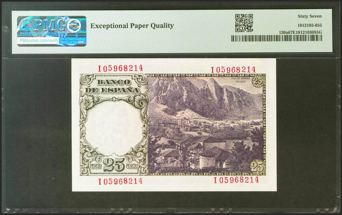 25 Pesetas. 19 de Febrero de 1946. Serie I. (Edifil 2021: 450a, Pick: 130a). Raro en esta excepcional calidad, apresto original. SC. Encapsulado PMG67EPQ.