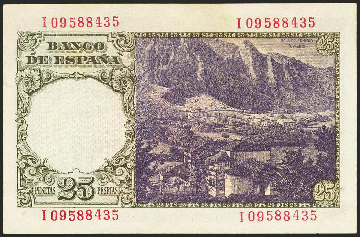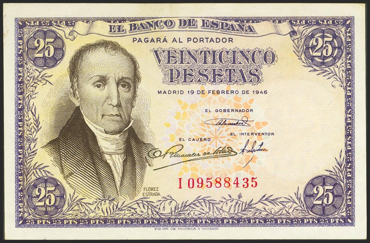 25 Pesetas. 19 de Febrero de 1946. Serie I. (Edifil 2021: 450a). Conserva parte de su apresto original. EBC.