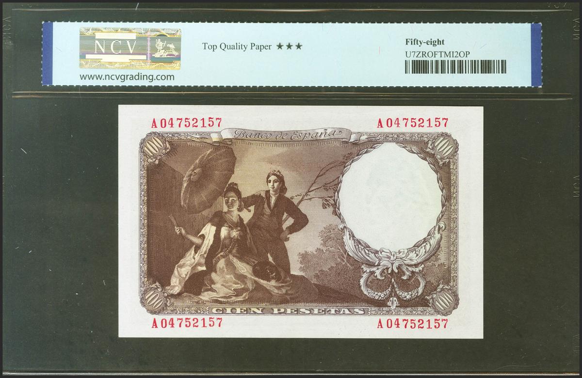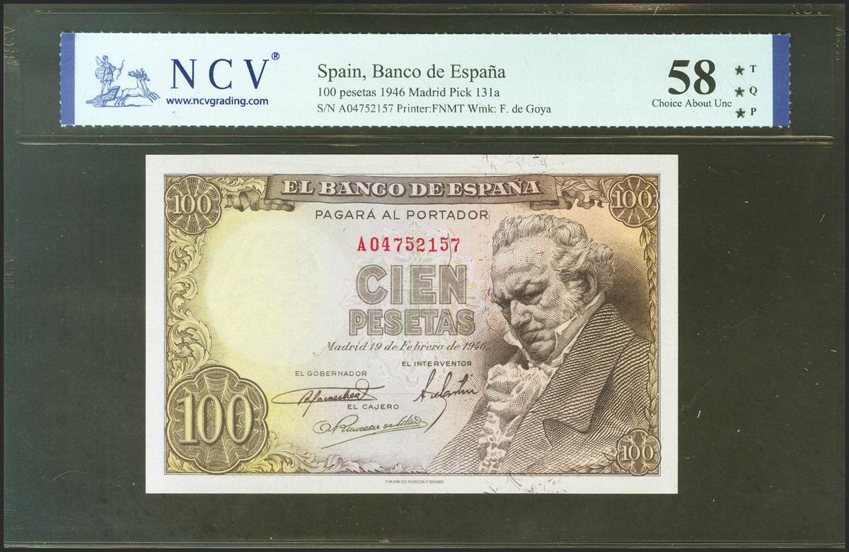 100 Pesetas. 19 de Febrero de 1946. Serie A. (Edifil 2021: 451a, Pick: 131a). Apresto original. EBC+++. Encapsulado NCV58TQP.