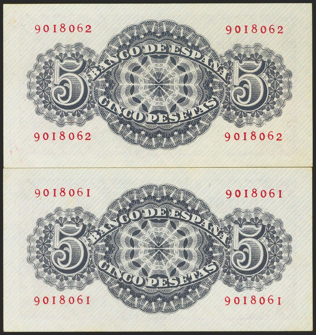 5 Pesetas. 12 de Abril de 1947. Pareja correlativa. Sin serie. (Edifil 2021: 454). Conserva gran parte del apresto original y manchitas del tiempo. SC--.