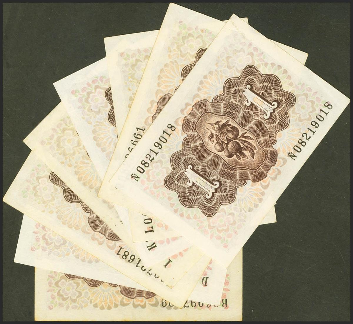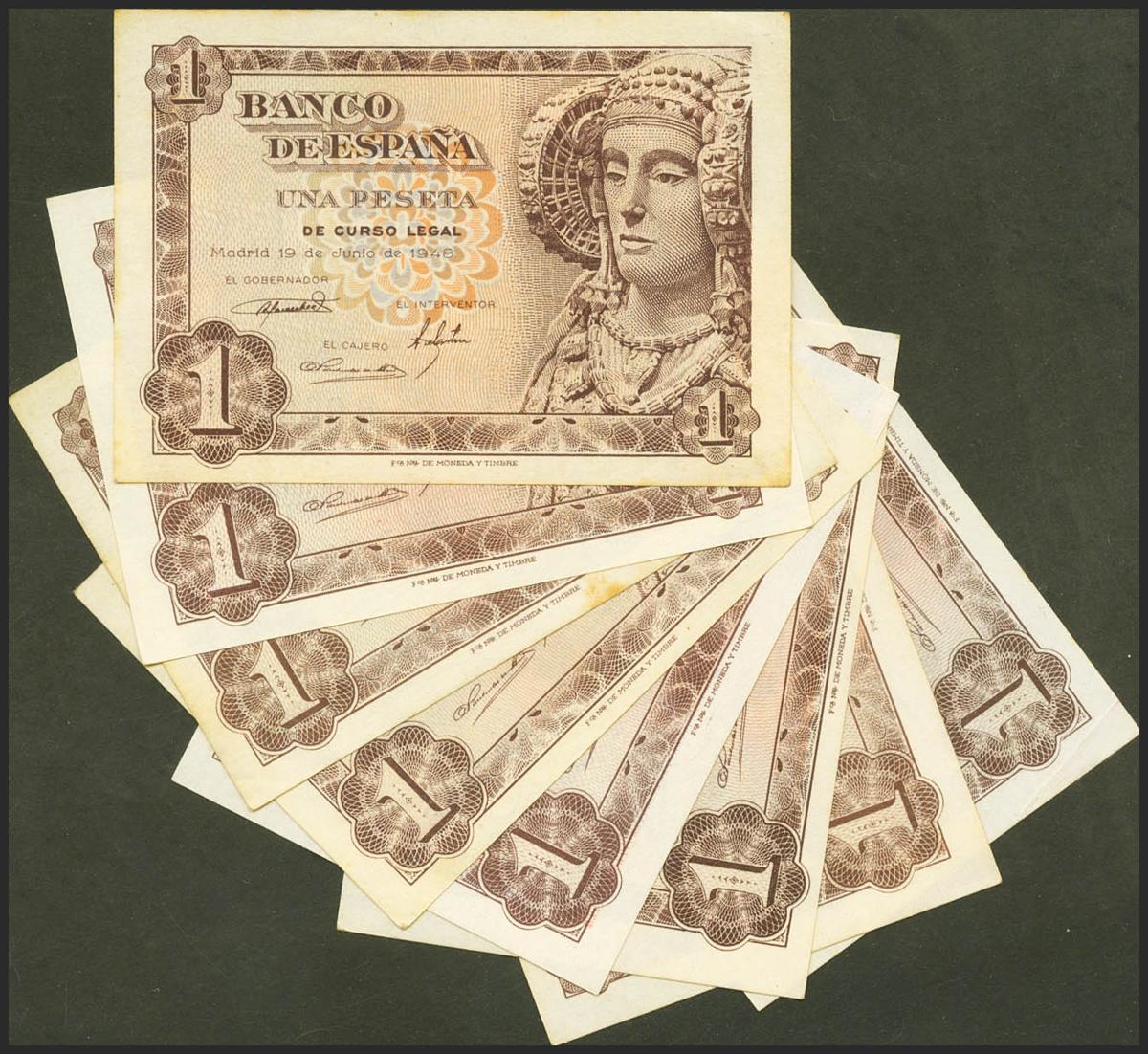 Conjunto de 8 billetes de 1 Peseta de 19 de Junio de 1948, con las series B, D, H, I, K, L, Ñ (2), respectivamente (Edifil 2021: 457a). SC-/EBC+.