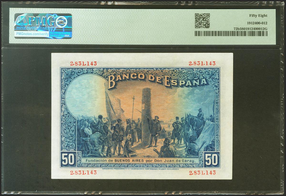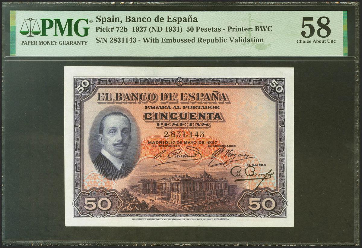 50 Pesetas. 17 de Mayo de 1927. Sin serie y sello en seco "Gobierno Provisional de la República / 14 Abril 1931". (Edifil 2021: 339, Pick: 72b). Raro en esta calidad. EBC++. Encapsulado PMG58.