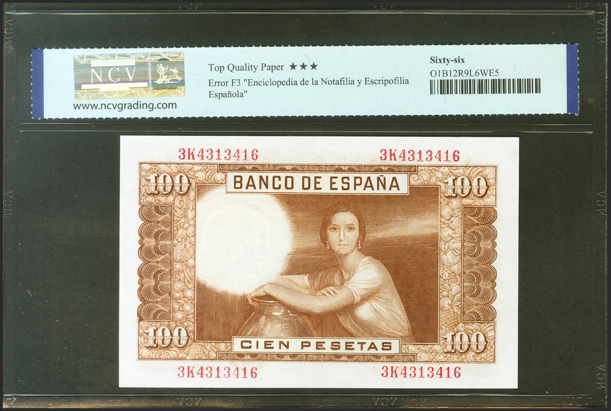 100 Pesetas. 7 de Abril de 1953. Error firma de cajero invertida e impresa en la parte superior derecha. Serie 3K. (Edifil 2021: 464c, Pick: 145a). Inusual. SC. Encapsulado NCV66TQP.