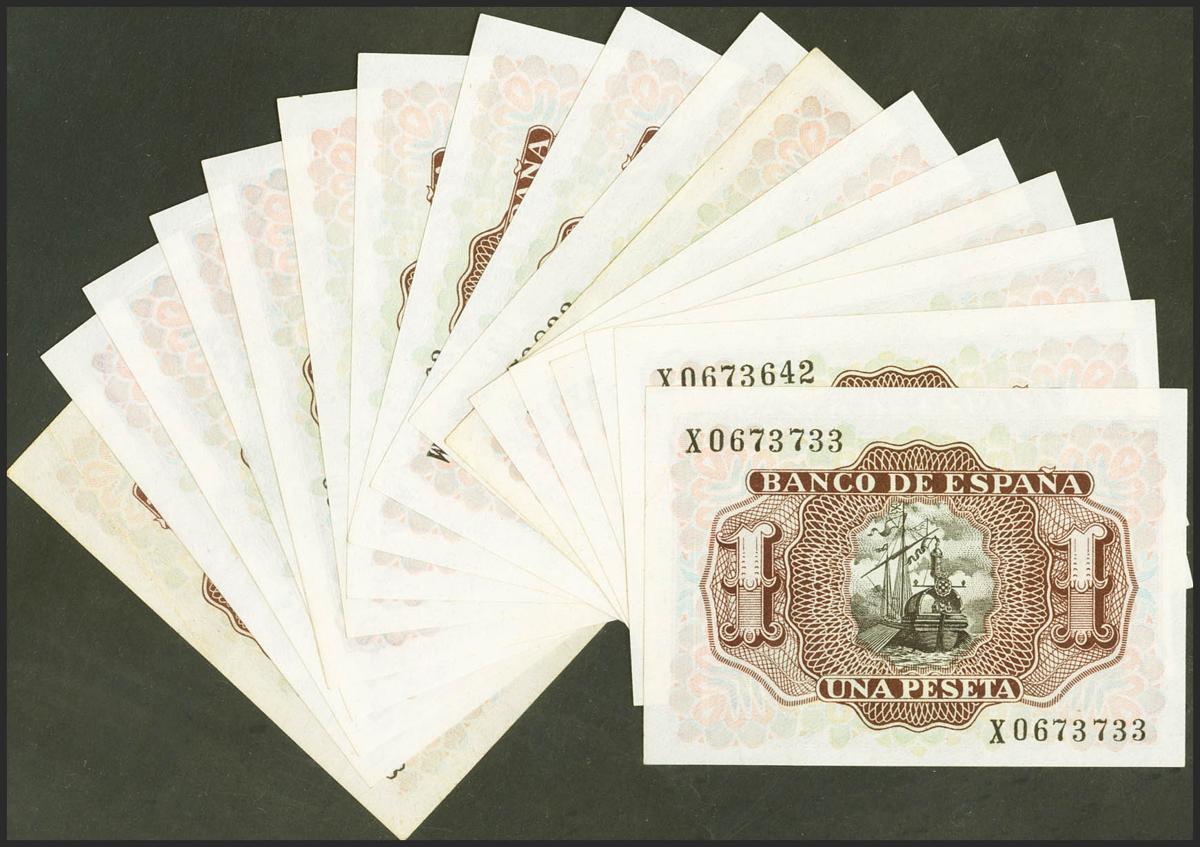 Conjunto de 17 billetes de 1 peseta, algunos de ellos correlativos, emitidos el 22 de Julio de 1953, sin serie y con las series H, V (3), W (4) y X, respectivamente (Edifil 2021: 465, 465a), conservando su apresto original. SC/EBC.