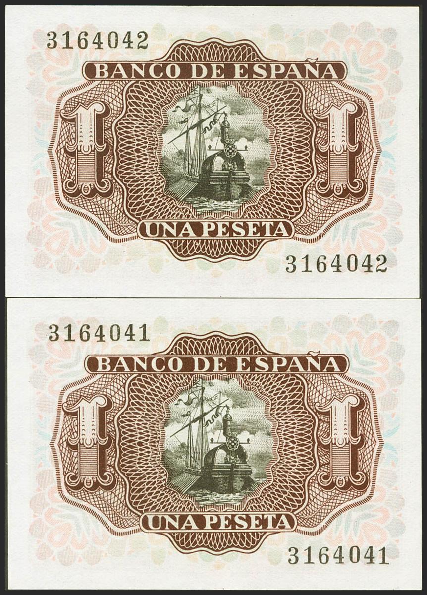 1 Peseta. 22 de Julio de 1953. Pareja correlativa. Sin serie. (Edifil 2021: 465). Apresto original. SC.