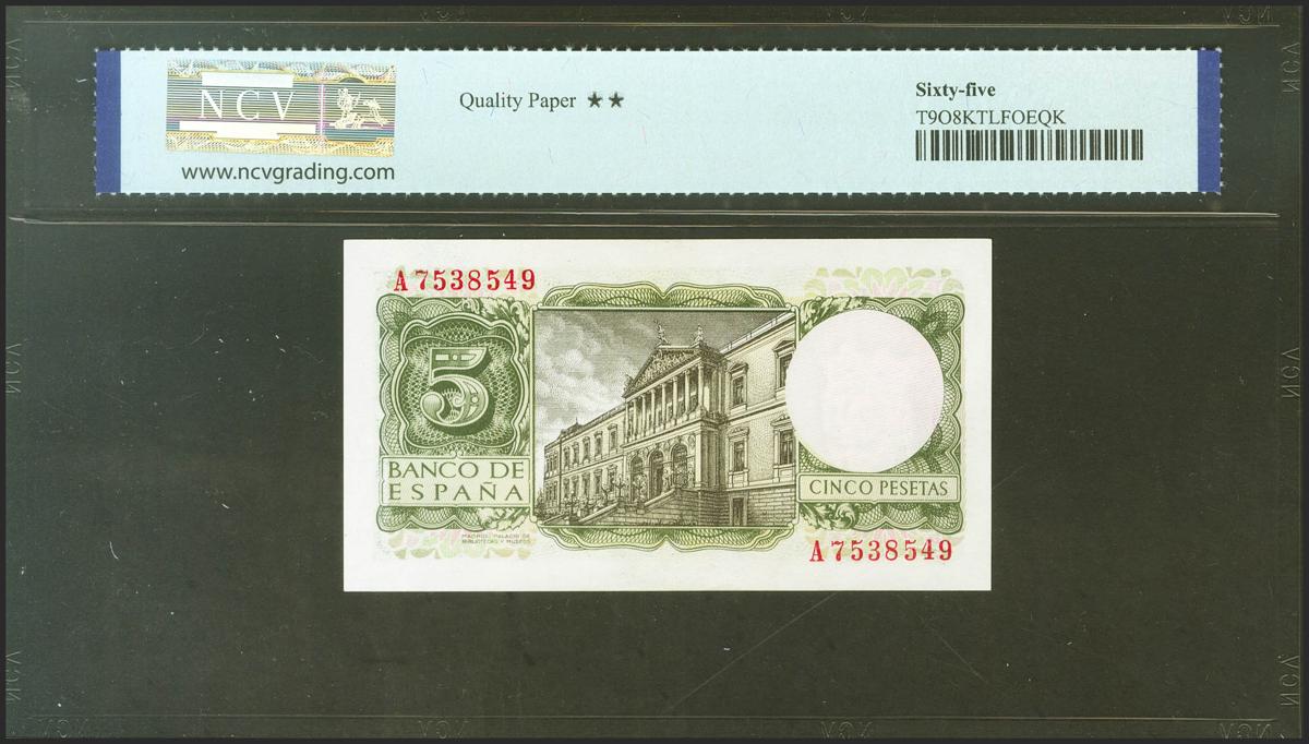 5 Pesetas. 22 de Julio de 1954. Serie A. (Edifil 2021: 466a, Pick: 146a). Apresto original. SC. Encapsulado NCV65.