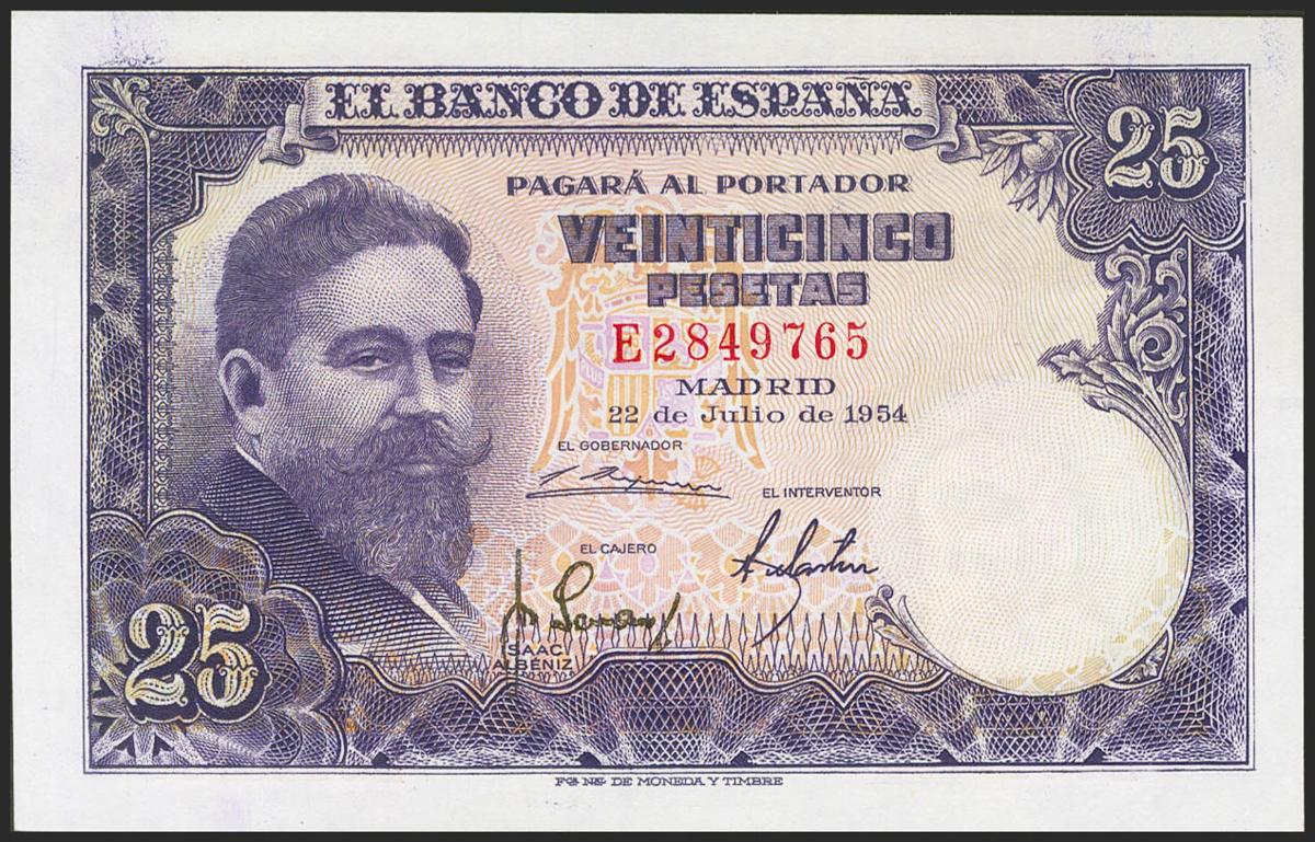 25 Pesetas. 22 de Julio de 1954. Serie E. (Edifil 2021: 467a). Conserva todo su apresto original. EBC+.