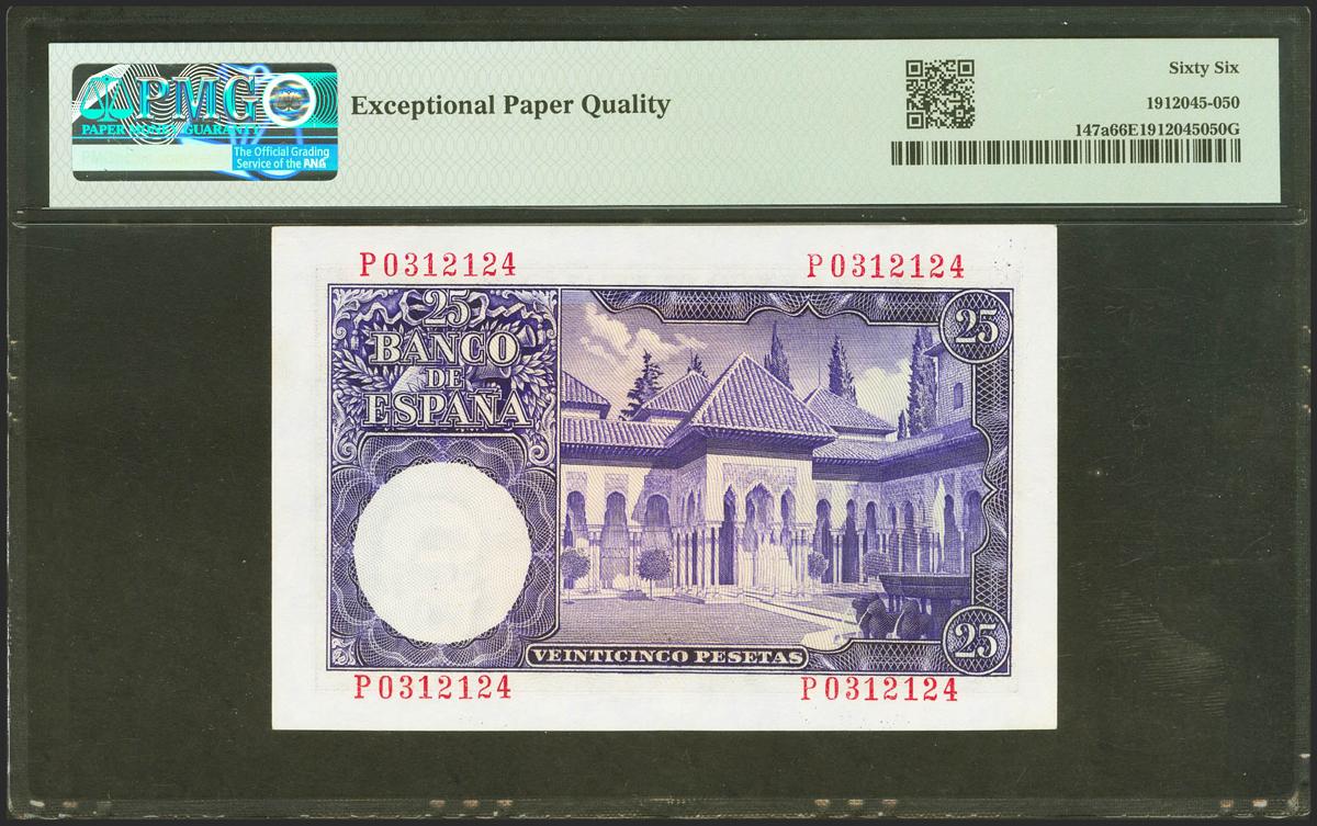 25 Pesetas. 22 de Julio de 1954. Serie P, última serie emitida. (Edifil 2021: 467b, Pick: 147a). Muy rara serie, especialmente en esta excepcional calidad, apresto original. SC. Encapsulado PMG66EPQ.