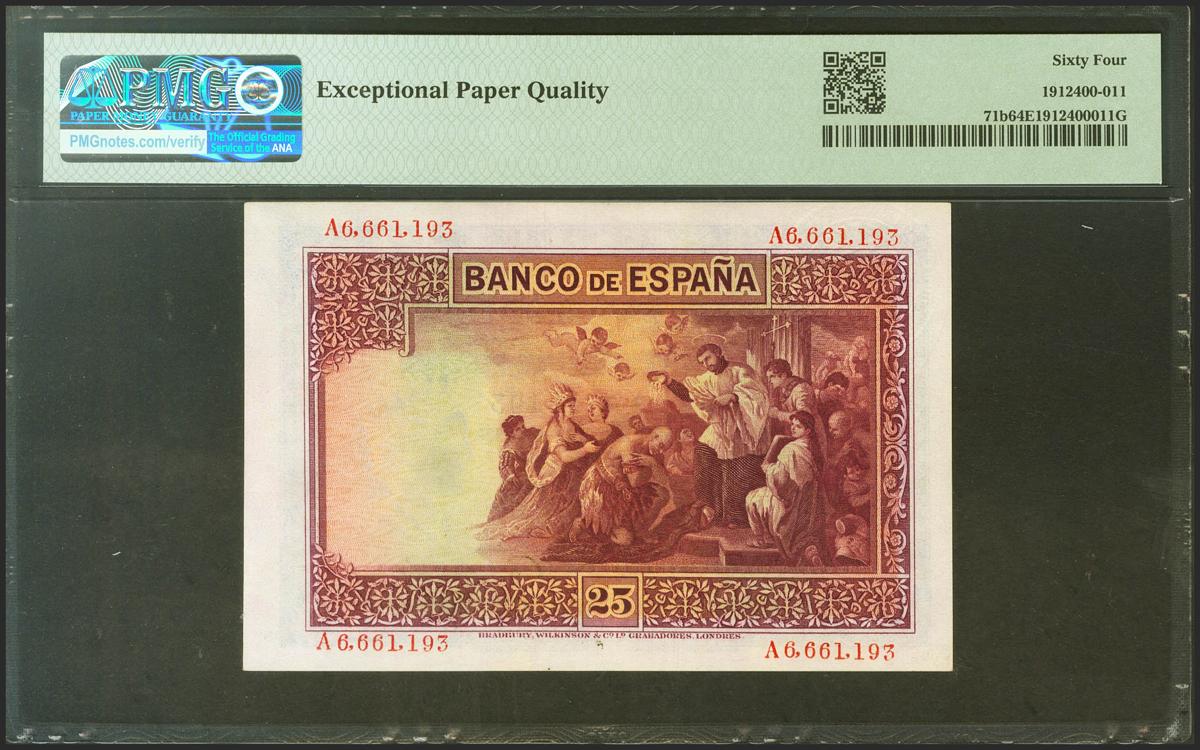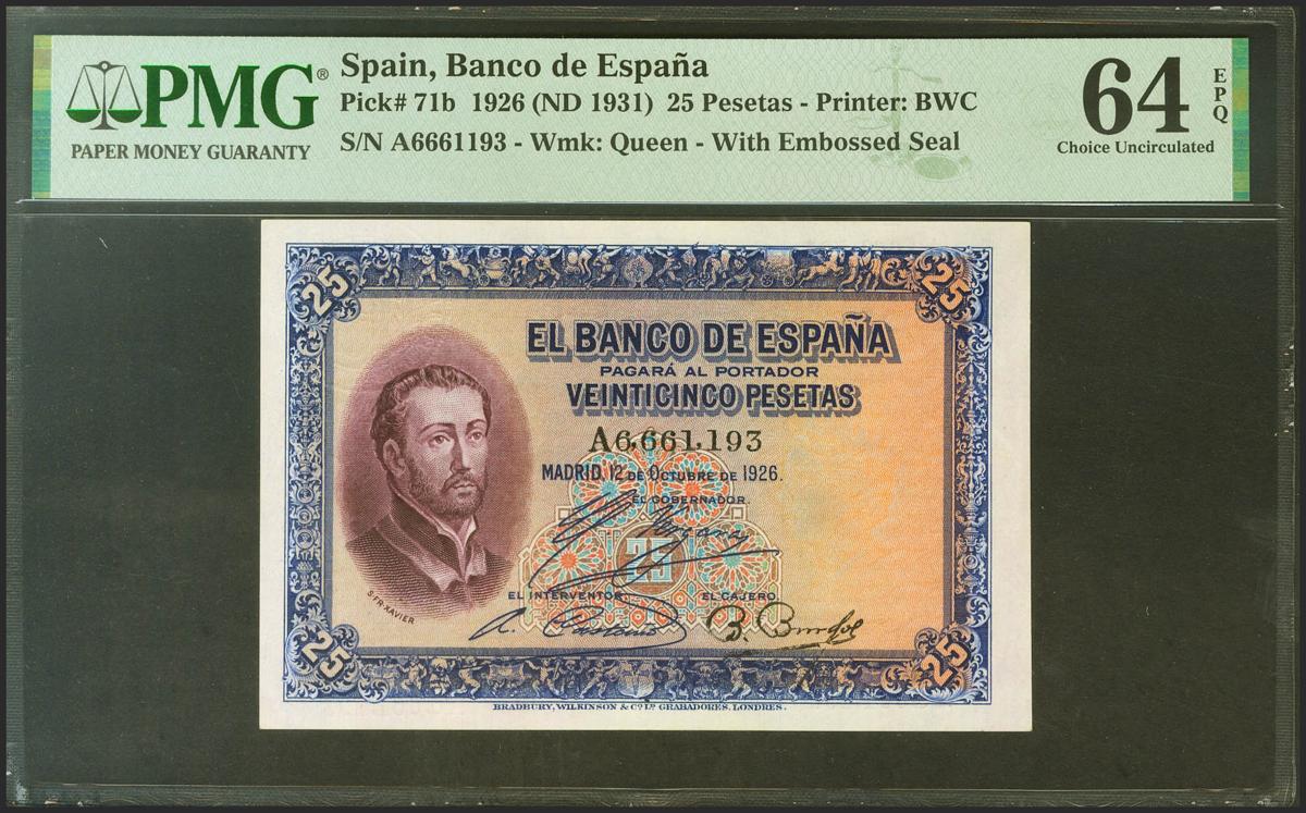 25 Pesetas. 12 de Octubre de 1926. Serie A y sello en seco GOBIERNO PROVISIONAL DE LA REPUBLICA / 14 ABRIL 1931. (Edifil 2021: 335, Pick: 71b). Rarísimo en esta calidad y apresto original. SC. Encapsulado PMG64EPQ.