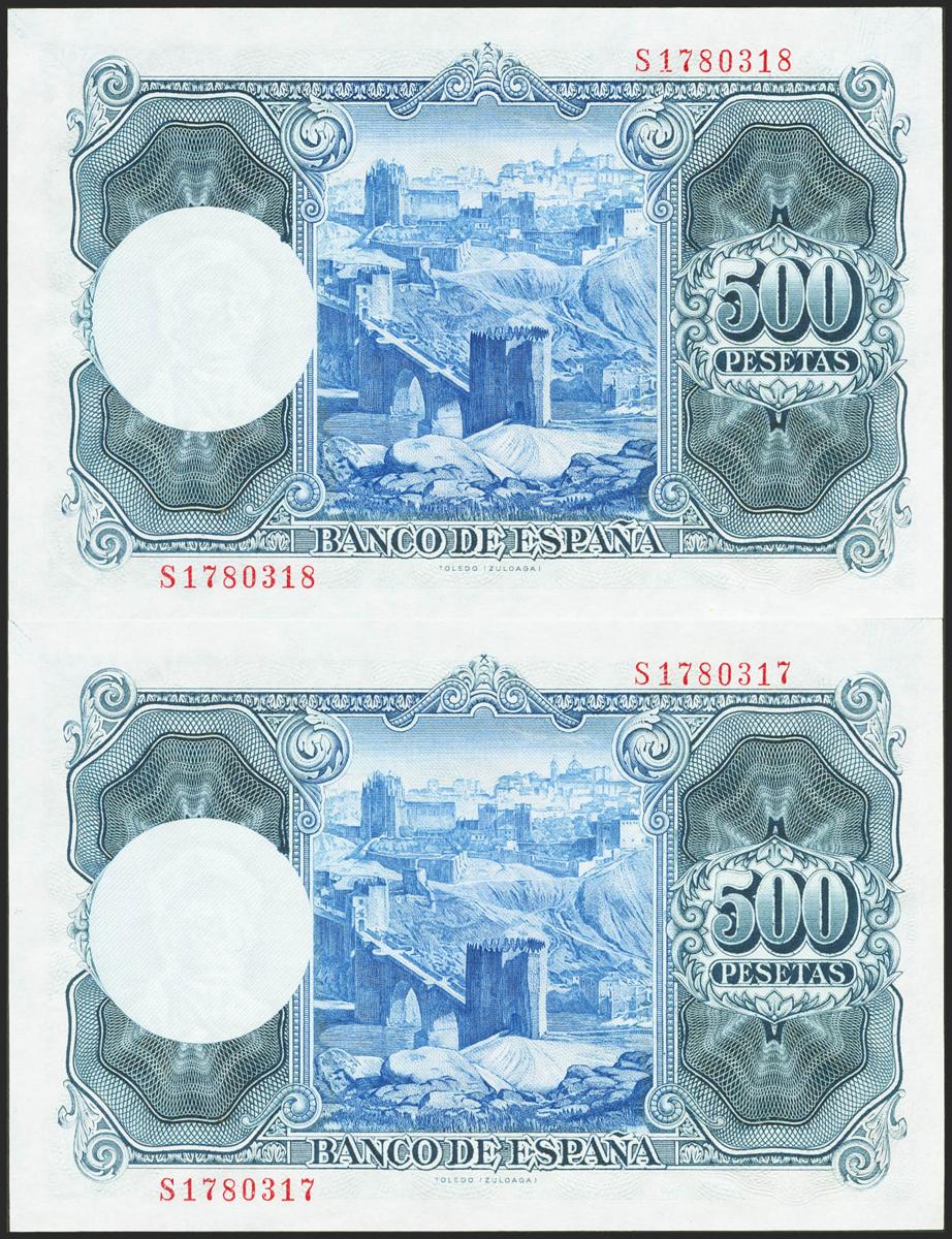 500 Pesetas. 22 de Julio de 1954. Pareja correlativa. Serie S. (Edifil 2021: 468b). Conserva todo su apresto original. SC.