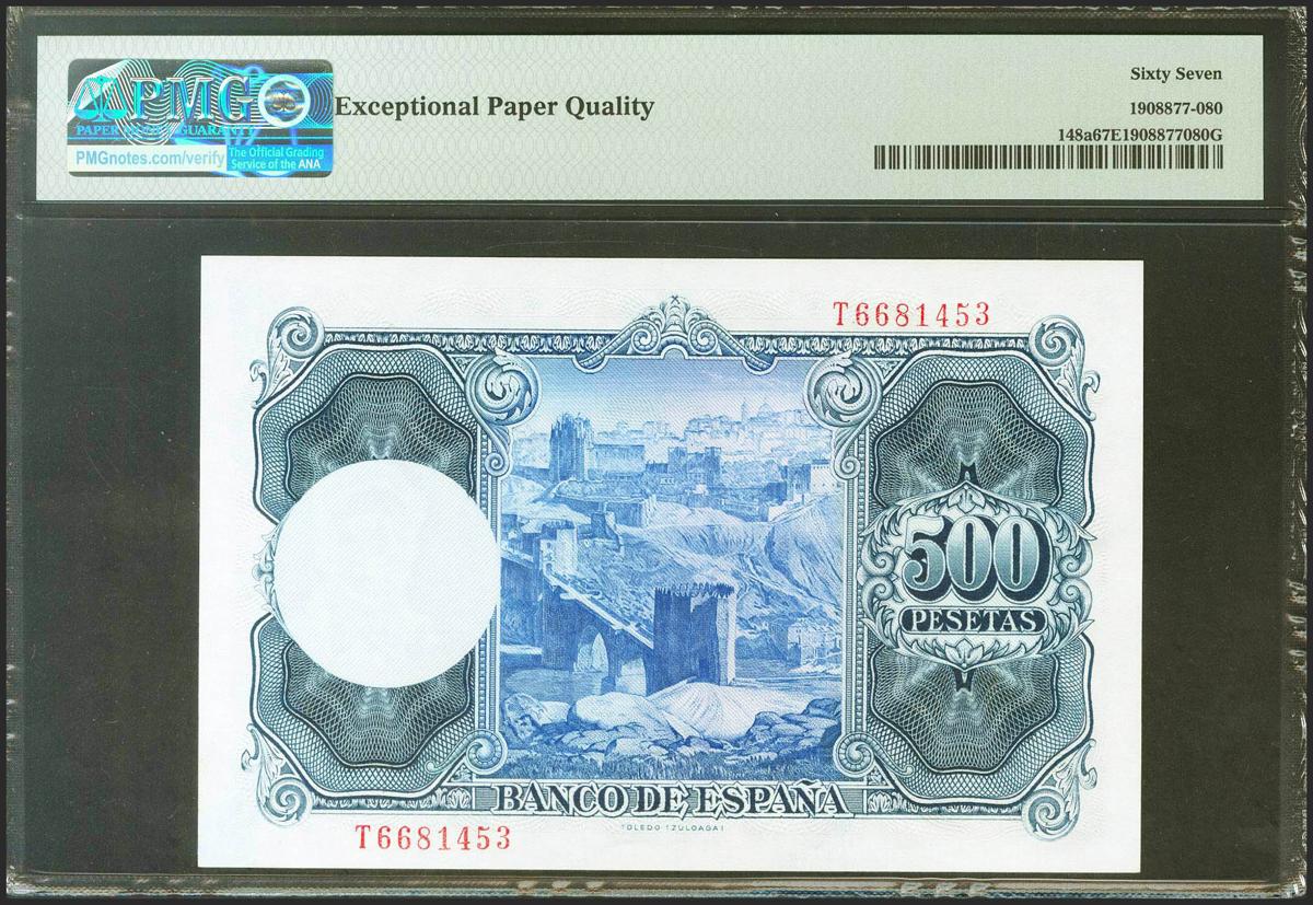 500 Pesetas. 22 de Julio de 1954. Serie T. (Edifil 2021: 468b, Pick: 148a). Muy raro en esta excepcional calidad y apresto original. SC. Encapsulado PMG67EPQ.