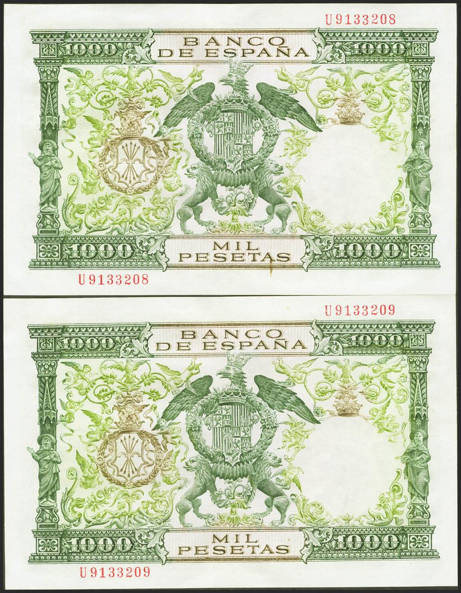 1000 Pesetas. 29 de Noviembre de 1957. Pareja correlativa. Serie U. (Edifil 2021: 469b). Apresto original. EBC+.