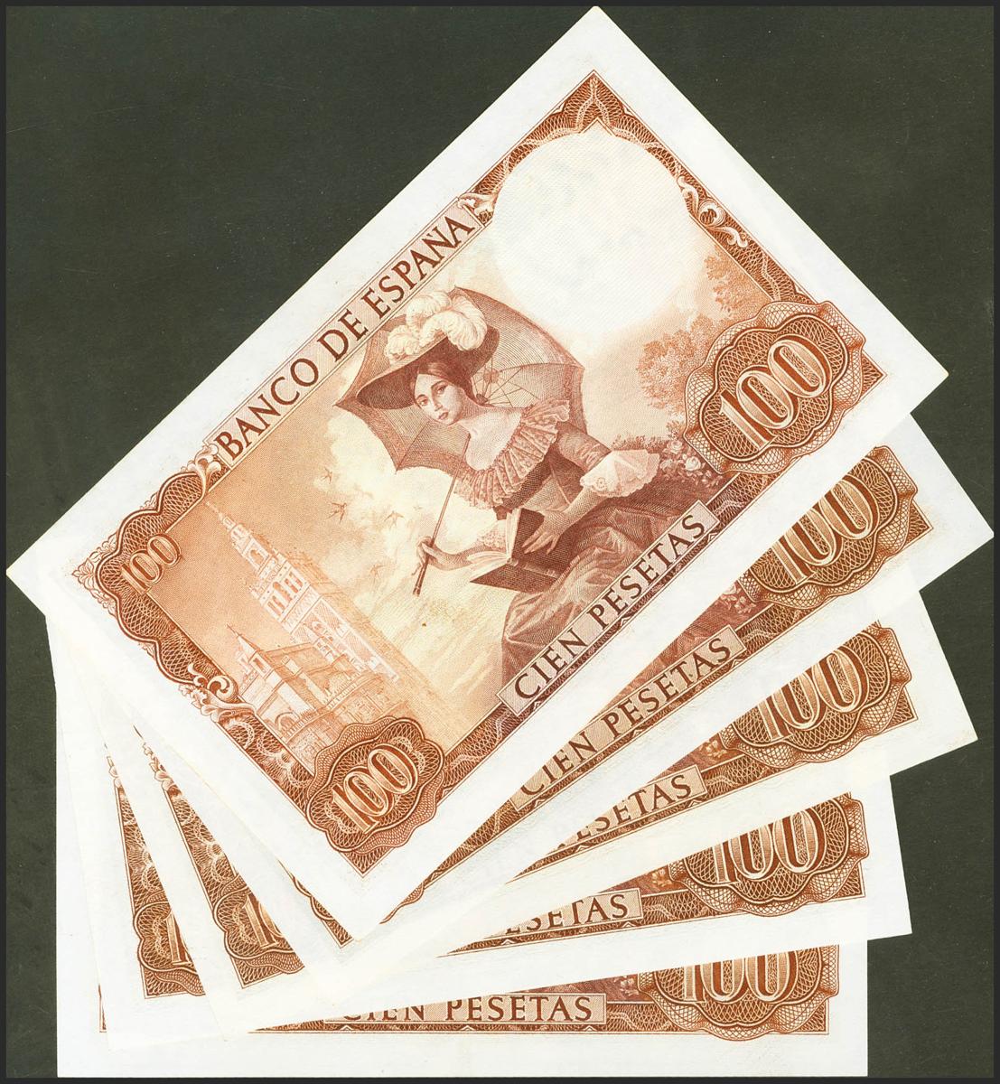 Conjunto de 5 billetes de 100 Pesetas, emitidos el 19 de Noviembre de 1965, sin serie (3), serie E y serie H, respectivamente (Edifil 2021: 470, 470a). SC/EBC++.