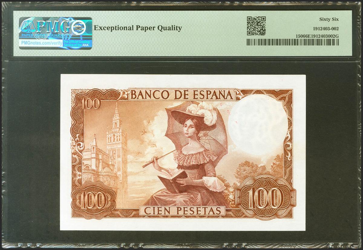 100 Pesetas. 19 de Noviembre de 1965. Sin serie y numeración bajísima (0000743). (Edifil 2021: 470, Pick: 150). Inusual en esta excepcional calidad, apresto original. SC. Encapsulado PMG66EPQ.