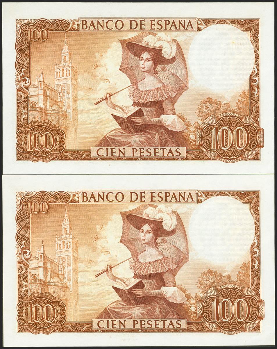 100 Pesetas. 19 de Noviembre de 1965. Pareja correlativa. Sin serie. (Edifil 2021: 470). Conserva todo su apresto original. SC.